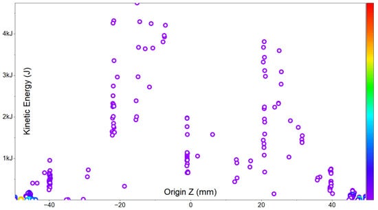 According to the 3D simulation, the kinetic energy () distribution of fragments recorded along the axial dimension (Z axis) of the pipe has two lobes, with the highest in the half of the pipe containing the detonation point (Figure 8). At the ends of the pipe, the kinetic energy is lower, but the density of fragments is higher, as expected due to the loss of the detonation pressure at the ends of the pipe. The middle area of the pipe generates fragments with higher mass and energies, these fragments generating through their dispersion a very high degree of lethality.