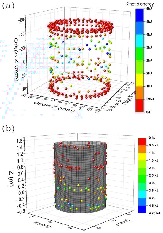 (a) Initial positions and kinetic energy distribution of the fragments plotted on the cylindrical surface of the steel pipe; (b) the spatial distribution of positions and kinetic energies of the resulting fragments on cylindrical surface of 2 m high with respect to the ground built up at 2 m distance around the detonation place.