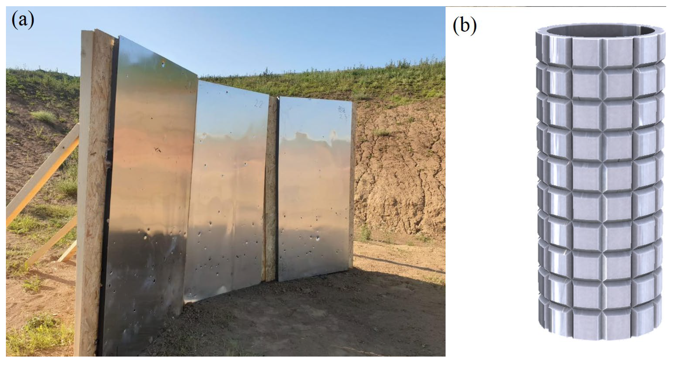 - Zhou, M.; Wu, C.; An, F.; Liao, S.; Yuan, X.; Xue, D.; Liu, J. Acceleration Characteristics of Discrete Fragments Generated from Explosively-Driven Cylindrical Metal Shells. Materials 2020, 13, 2066. [Google Scholar] [CrossRef] [PubMed]