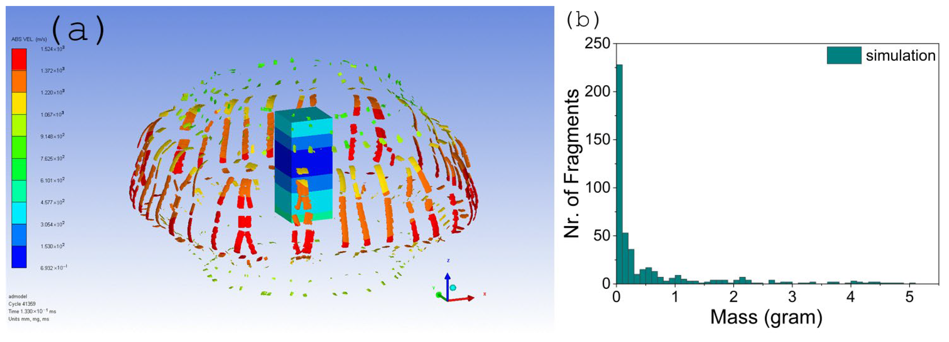 - Grisaro, H.; Dancygier, A.N. Numerical study of velocity distribution of fragments caused by explosion of a cylindrical cased charge. Int. J. Impact Eng. 2015, 86, 1–12. [Google Scholar] [CrossRef]