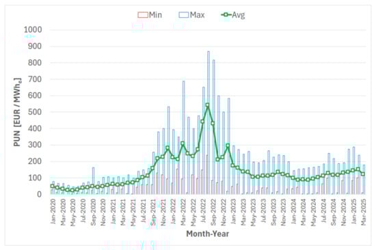 Monthly average, maximum, and minimum PUN values from January 2020 to March 2025 (data from https://gme.mercatoelettrico.org/it-it (accessed on 15 April 2025)).