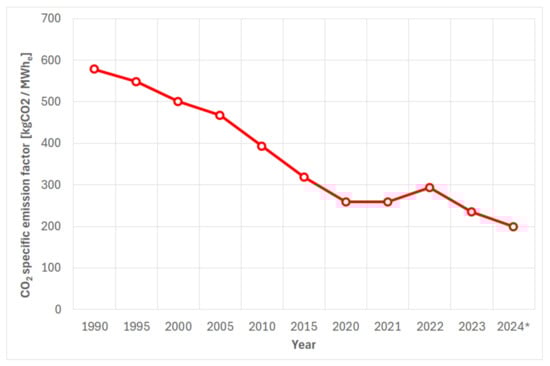 CO2 emission factor for electricity consumption in Italy (* data for 2024 are not definitive [21]).