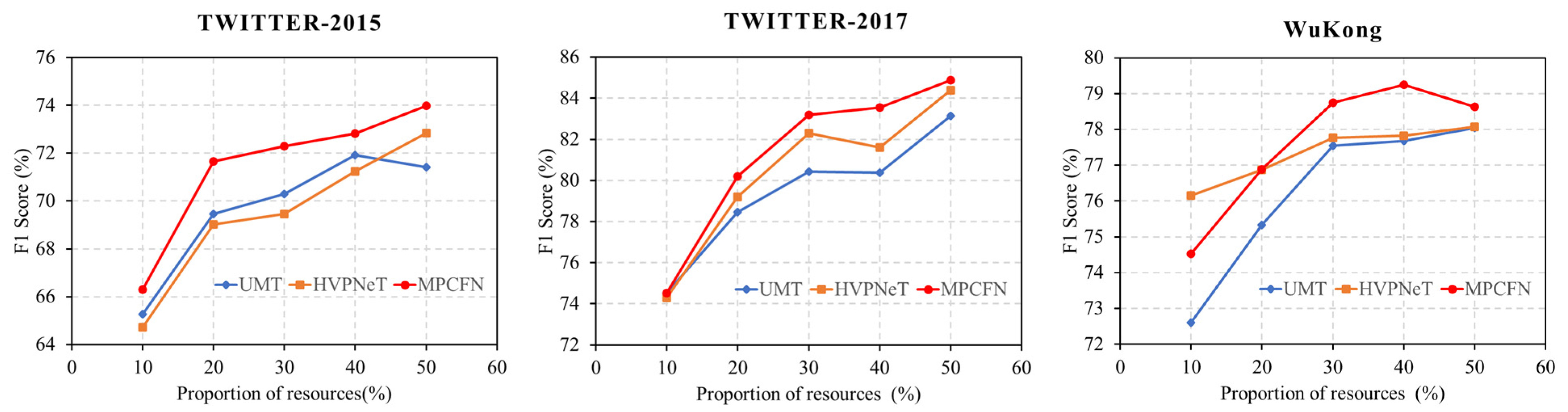 - Comparing current multimodal models with text-based unimodal methods shows that multimodal approaches generally perform better on English datasets like TWITTER-2015 and TWITTER-2017, with a maximum F1 score improvement of about 3.5%. However, on the Chinese dataset WuKong, the maximum performance improvement is approximately 1% (for instance, when comparing RpBERT with BERT), and, in some cases, the performance of certain multimodal models (such as UMGF and MGCMT) is not superior to text-based methods. This highlights the need for further enhancement of multimodal models.