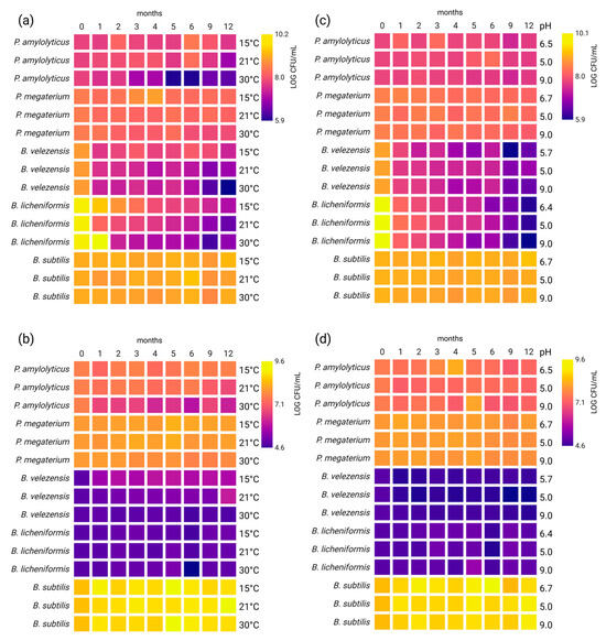 Survivability of bacteria under different storage conditions: (a) temperature—vegetative cells, (b) temperature—spores, (c) pH—vegetative cells, (d) pH—spores. The heatmaps show changes in the number of viable cells (LOG CFU/mL) measured at each indicated time point (0, 1, 2, 3, 4, 5, 6, 9, and 12 months). The colour intensity reflects the CFU/mL value, with lighter colours corresponding to higher bacterial counts. Created in BioRender. Rowińska, P. (2025) https://BioRender.com/f69a7c3 (accessed on 4 November 2025).
