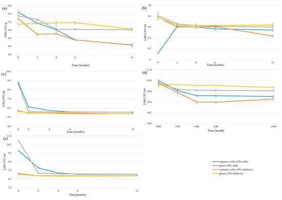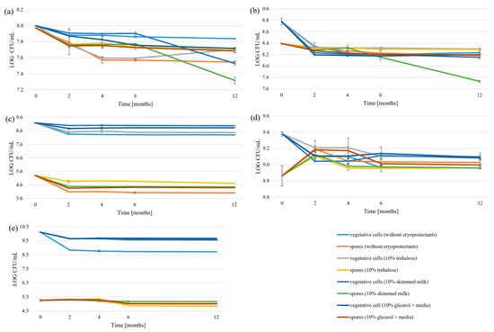 A temperature of −80 °C has been suggested as optimal for long term storage [,]. Our results confirm that survival rates can remain stable for up to 12 months with an appropriate cryoprotectant. Similarly to freeze-drying, spores exhibited higher survival rates than vegetative spores, except for B. velezensis. Glycerol mixed with medium acted as an effective cryoprotectant, which is in conformity with literature data [,]. However, solutions of trehalose and skimmed milk were more effective with the tested strains. The appropriate choice of cryoprotectant depends on the bacterial strain and influence survival rates. This has been the subject of extensive research. For instance, one study demonstrated that B. subtilis preserved in 10% glycerol or 10% skimmed milk exhibited high viability after 60 days of storage at −80 °C []. Other compatible solutes for freezing include glycine betaine, which further improves the cold stress tolerance of B. subtilis, allowing it to proliferate even at low temperatures []. Apart from commonly used cryoprotectants, Tween 80 has been identified as an effective cryoprotectant for B. licheniformis, not only protecting cells during freezing but also facilitating faster recovery post-thawing []. The production of biopreparations requires storage of pure cultures of microorganisms. This study investigated freezing as a method for long-term storage, as freezing ensures that bacteria remain viable and free from contamination or genetic drift, which is supported by literature data [,,]. Freezing at low temperatures is commonly used to preserve various types of microorganisms during storage and avoid genetic drift. Freezing at ultra-low temperatures, such as in liquid nitrogen or at −80 °C, is a widely used and highly effective method for preserving fungi that produce spores, such as Aspergillus and Penicillium [,]. Cryoprotective agents such as glycerol or DMSO are often used to prevent cell damage during freezing and thawing. Non-spore-forming bacteria, such as Pseudomonas aeruginosa, can also be stored at −80 °C with cryoprotective agents [].