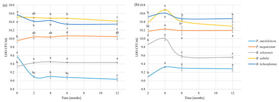 Lowering the storage temperature generally resulted in higher survivability during long-term storage. This was particularly visible for P. amylolyticus after 12 months of storage. For this strain, 1.3 ± 0.03 LOG CFU/mL higher survivability of vegetative cells was observed at 15 °C compared to 30 °C, while at room temperature survivability was in between these rates (Figure 2a, Table S1a). The same pattern was seen in the survivability of spores (1.5 ± 0.02 LOG CFU/mL higher in 15 °C) (Figure 2b, Table S1b). Other tested strains also showed higher survivability at 15 °C or room temperature than at 30 °C during long-term storage. However, for both B. licheniformis and B. subtilis an increase in the number of vegetative cells was observed at 30 °C, in the first month of storage for B. licheniformis and in the sixth month for B. subtilis.