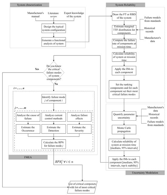 The objective of this methodology is to enable a systematic prioritization of critical components and failure modes in complex engineering systems that account for uncertainty. The framework integrates quantitative reliability techniques, such as RBD, FTA, and IMs, with qualitative failure analysis via FMEA. This two-level approach evaluates failure mode impact and assesses each component’s effects on system reliability. The method traces failure propagation through critical components and identifies the failure modes with the highest impact on system performance. By linking the identification of critical failures with their quantified effects on reliability, the framework indicates which components should be prioritized, while facilitating the development of actionable mitigations.