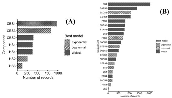 Using failure records from December 2015 to January 2020 (hours), Exponential, Weibull, and Lognormal TTF models were fitted using maximum likelihood for each component, selected the best family by AIC (BIC as tiebreaker), and assessed absolute fit with the Cramér–von Mises statistic (KS bootstrap p-values in Appendix A). Figure 4 summarizes both the empirical support (number of records) and the selected marginal family—panel (a) for the compaction system and panel (b) for the heavy-duty truck system. In line with mechanical wear mechanisms, Weibull predominates, while Exponential and Lognormal appear where memoryless or multiplicative effects are plausible. Full parameter estimates (with SEs) and diagnostics are reported in Appendix A. These fitted marginals feed directly into the system-level computation described next.