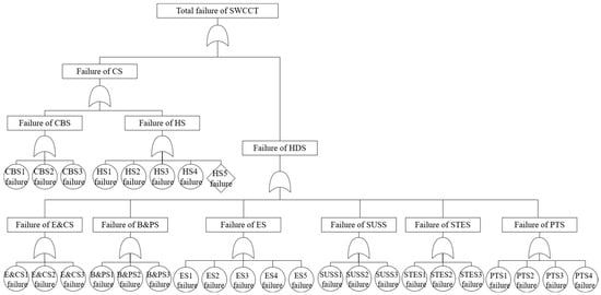Given the complexity of the SWCCT and the uncertainty regarding which subsystems contribute most critically to overall reliability, the quantitative stage of the case study was structured around an FTA (Figure 5). This approach was chosen because it provides a direct representation of how specific component or subsystem failures propagate to total system loss, aligning with the operational realities of the fleet. The FTA, when applied to the failure data collected from the trucks, revealed that the HS5 showed no record failures; the compaction system and truck-level subsystems—including power transmission, brakes, and hydraulics—were the main contributors to system risks.