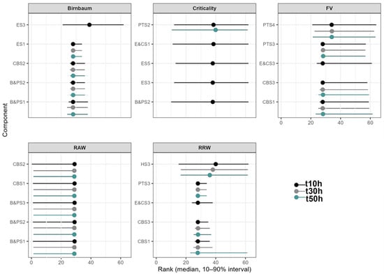 After all iterations, we summarize , subsystems failure probabilities and IMs by medians and 95% uncertainty intervals (Monte-Carlo percentiles). We also report rank stability, i.e., the proportion of iterations in which each element appears at the top- by a given IM, to indicate prioritization robustness.