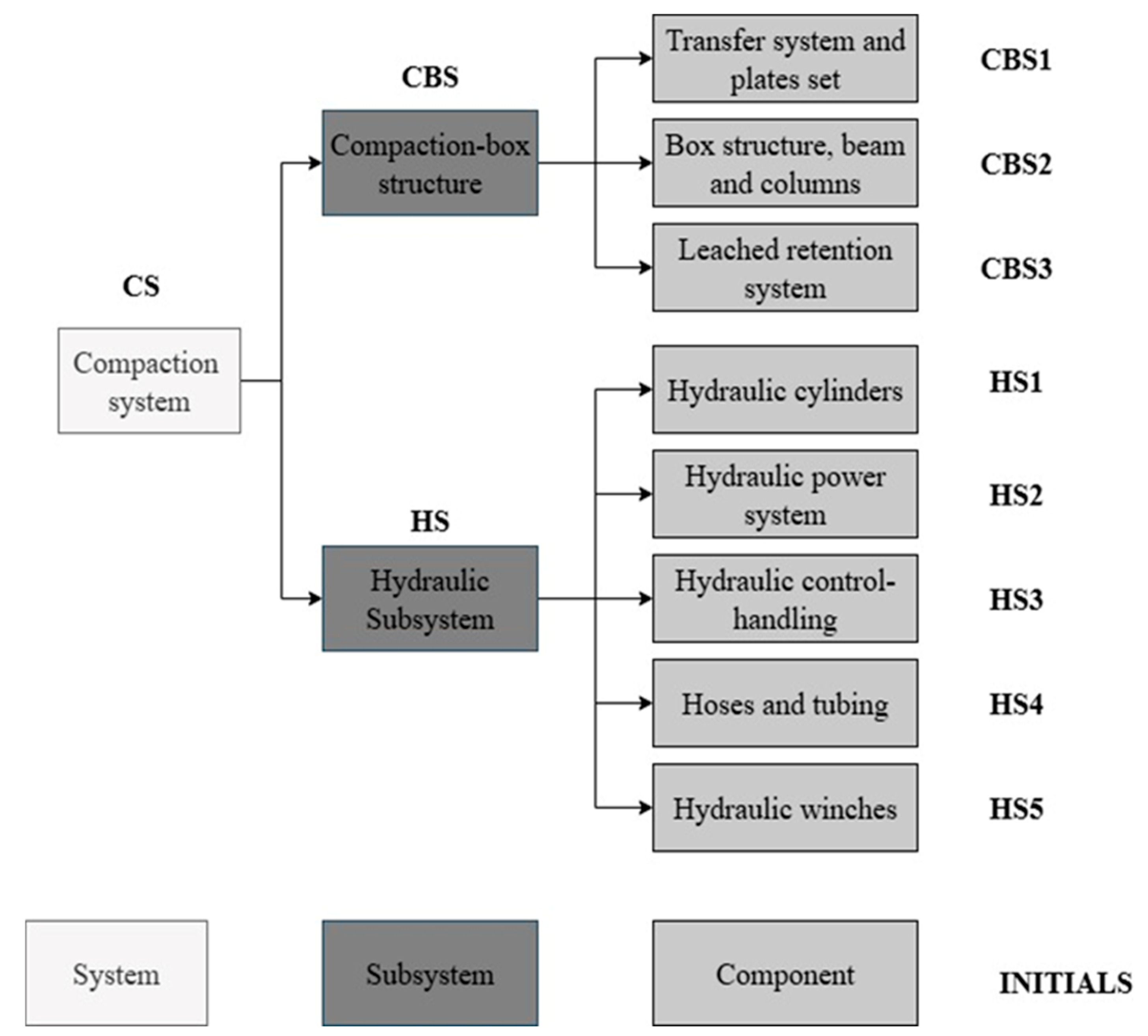 Building upon this system-level perspective, the subdivision into the compaction-box structure (CBS) and the hydraulic subsystem (HS) provides a more detailed view for analyzing reliability and risk propagation. CBS directly governs the mechanical integrity of waste containment, while the HS determines the performance and operational continuity of compaction (