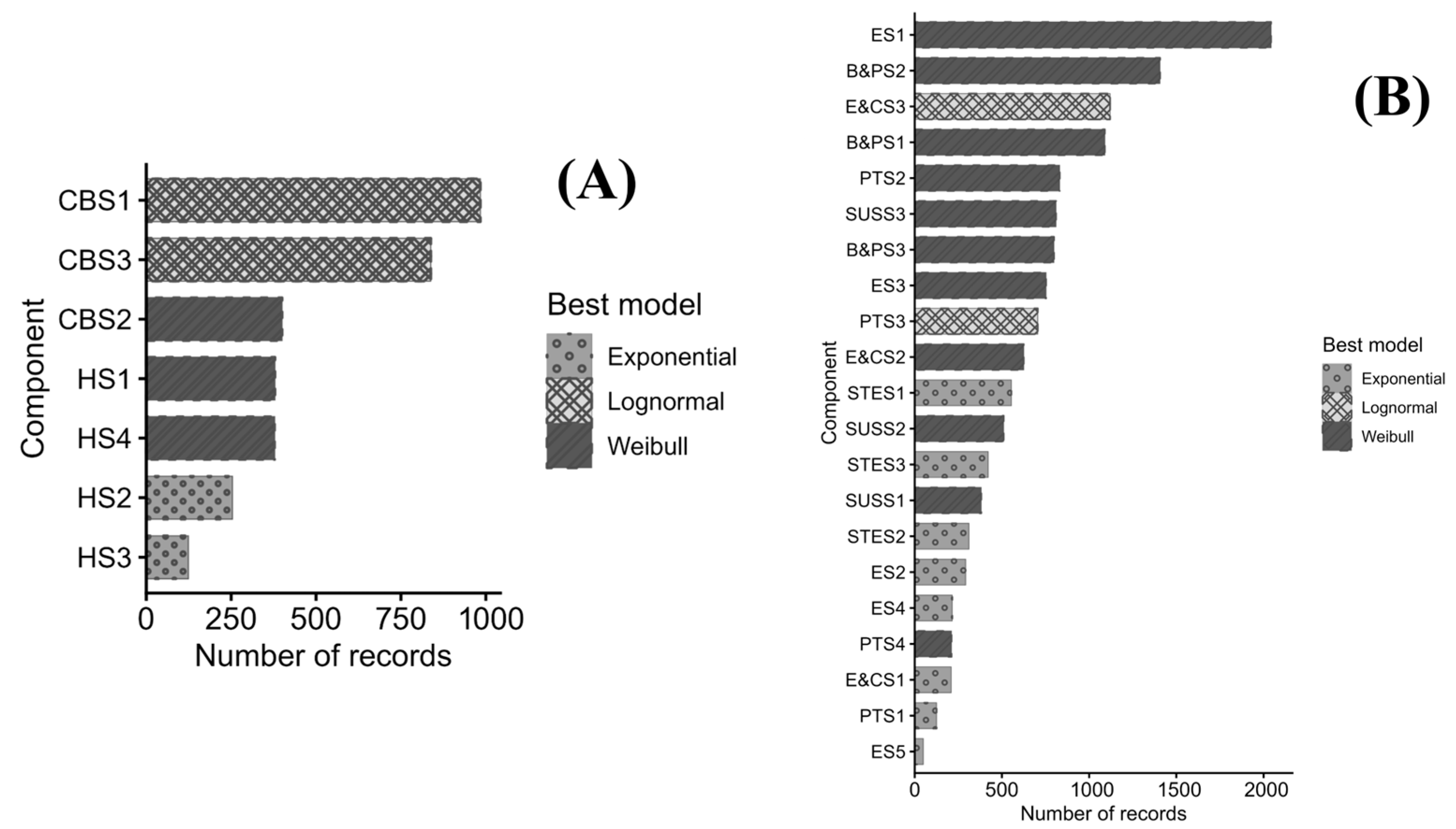 Figure 4 summarizes both the empirical support (number of records) and the selected marginal family—panel (a) for the compaction system and panel (b) for the heavy-duty truck system. In line with mechanical wear mechanisms, Weibull predominates, while Exponential and Lognormal appear where memoryless or multiplicative effects are plausible. Full parameter estimates (with SEs) and diagnostics are reported in