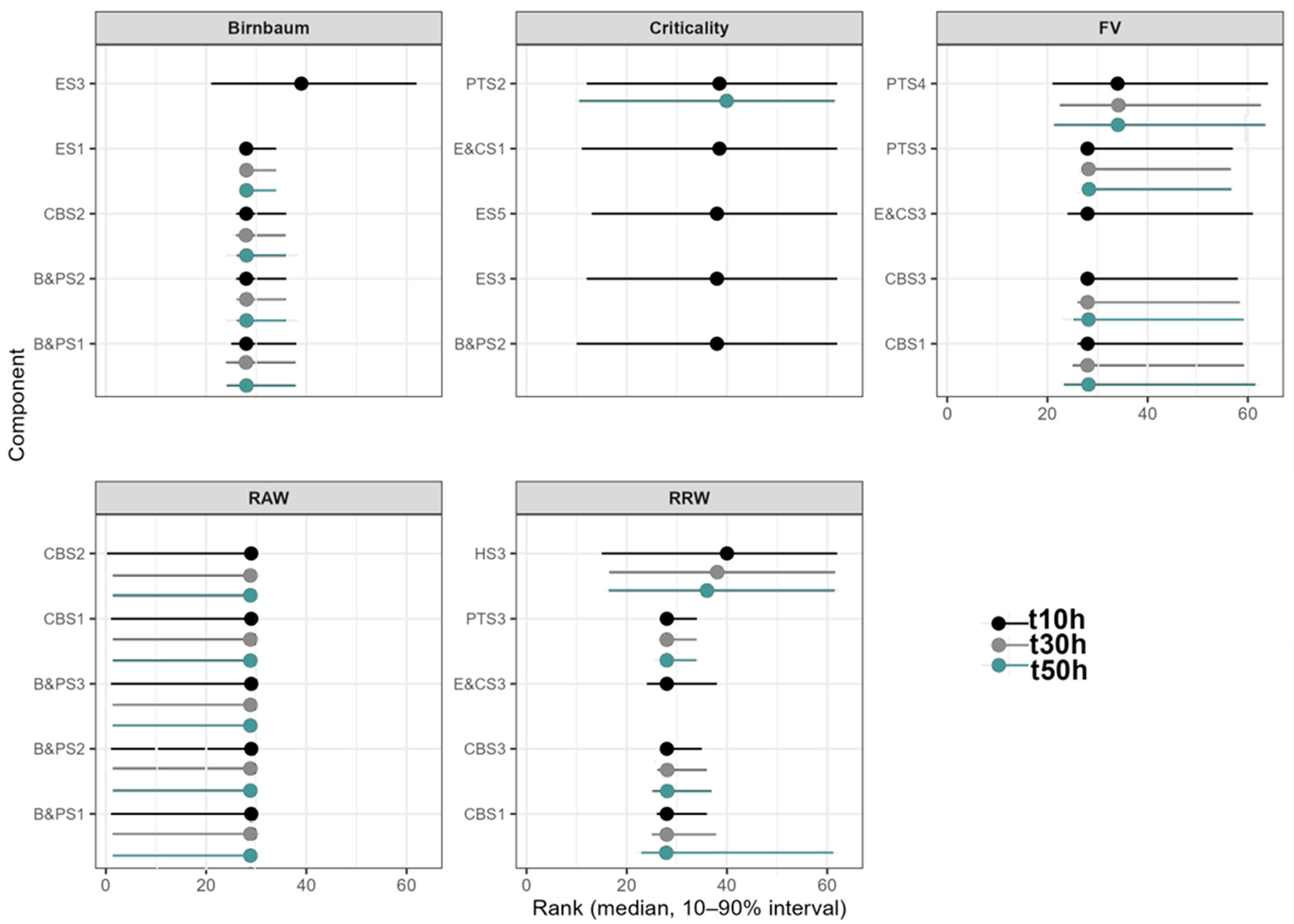 After all iterations, we summarize , subsystems failure probabilities and IMs by medians and 95% uncertainty intervals (Monte-Carlo percentiles). We also report rank stability, i.e., the proportion of iterations in which each element appears at the top- by a given IM, to indicate prioritization robustness.