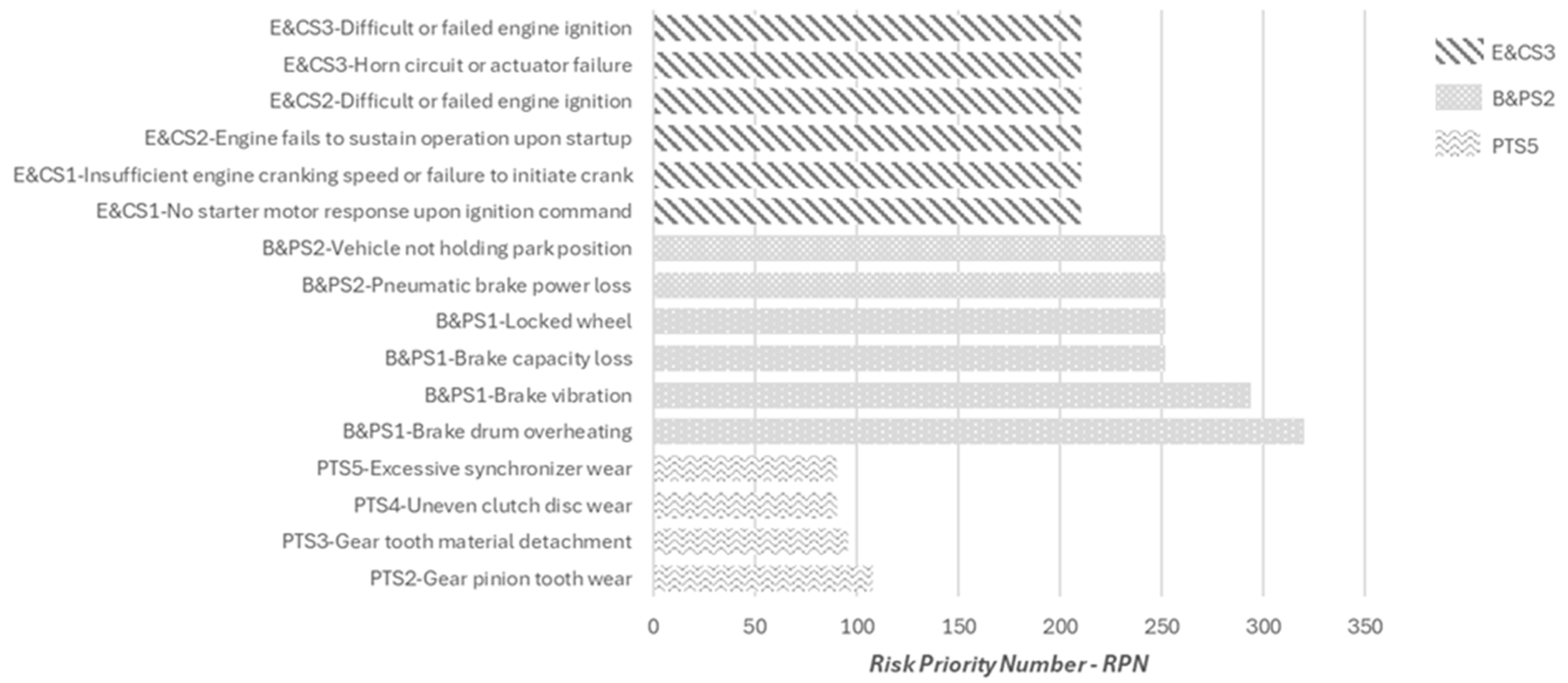The pneumatic braking subsystems require attention because two of their components show the highest RPN values and have safety implications. Brake drum overheating is a significant failure mode for braking subsystems, potentially caused by excessive braking without engine assistance. These results align with the IM analysis, confirming that the B&PS subsystem represents the main reliability bottleneck of the vehicle. The high NPR concentration in a limited set of modes implies that corrective actions focused on these faults can significantly reduce the overall operational risk.