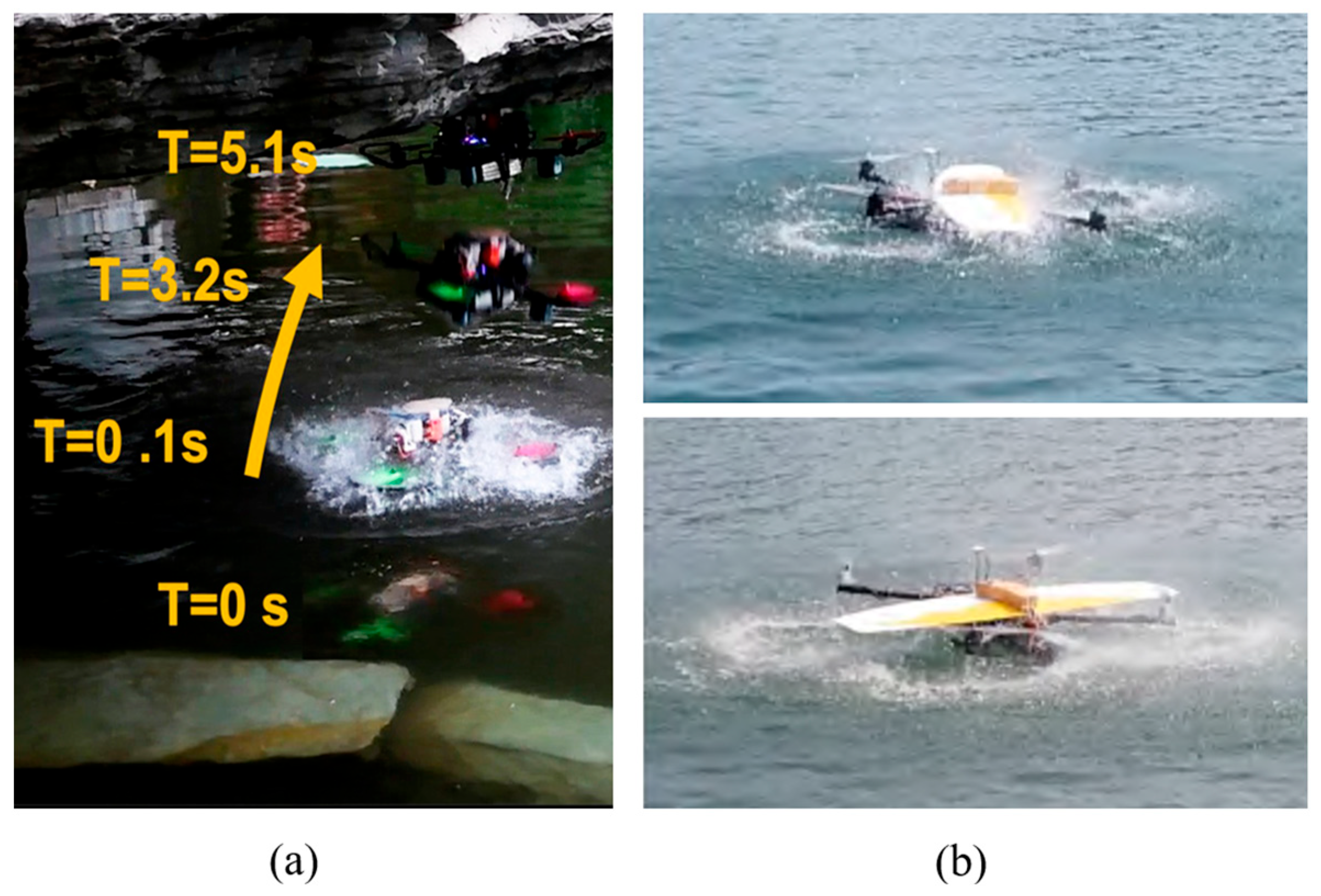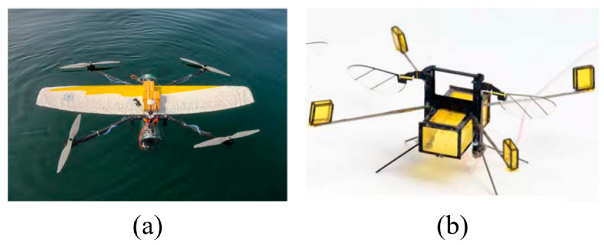 - Li, L.; Wang, S.; Zhang, Y.; Wainwright, D.K.; Kenaley, C.P.; Gong, Z.; Liu, Z.; Liu, H.; Guan, J.; Wang, T.; et al. Aerial-aquatic robots capable of crossing the air-water boundary and hitchhiking on surfaces. Sci. Robot. 2022, 7, eabm6695. [Google Scholar] [CrossRef] [PubMed]