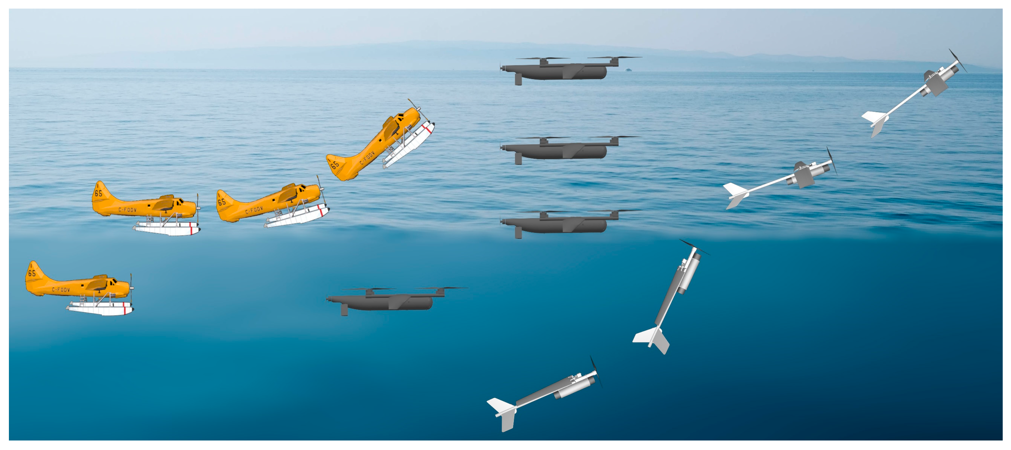 - Moore, J.; Fein, A.; Setzler, W. Design and analysis of a fixed-wing unmanned aerial-aquatic vehicle. In Proceedings of the 2018 IEEE International Conference on Robotics and Automation (ICRA), Brisbane, Australia, 21–25 May 2018; IEEE: New York, NY, USA, 2018; pp. 1236–1243. [Google Scholar]