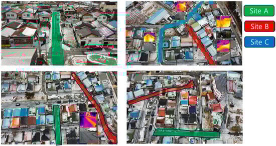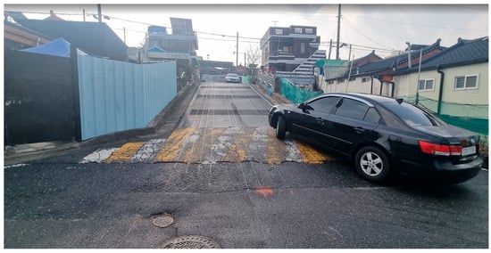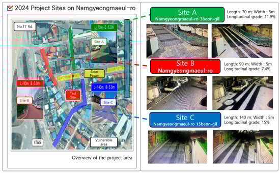 The field study was conducted on Namgyeong-maeul 3rd Road (Site A) in Daedeok-gu, Daejeon, South Korea, a steep residential slope with a length of approximately 70 m and an average gradient of 11.9%. This site was chosen because it represents the most hazardous segment among three RHS-installed locations, and it has a high frequency of winter icing accidents. The surrounding residential area is densely populated with elderly residents and vulnerable groups, making safe mobility during winter a critical social concern. A site overview image highlighting the steep slope and residential clustering is provided (Figure 3).