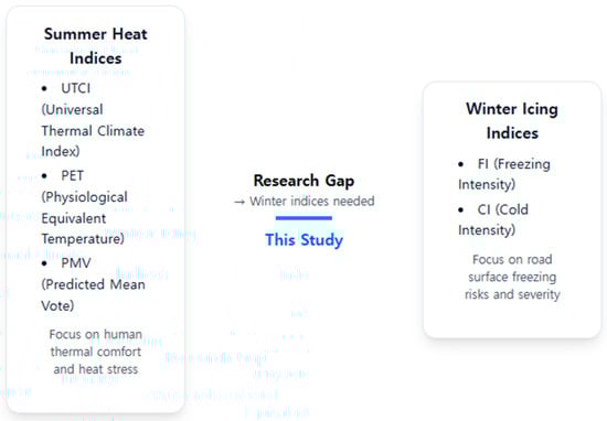 While thermal-comfort indices such as UTCI or PET assess human heat stress, this study focuses instead on operational indices that quantify pavement icing and mitigation efficiency [,,] (Figure 2).