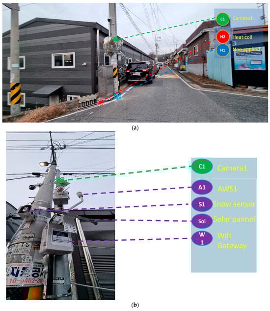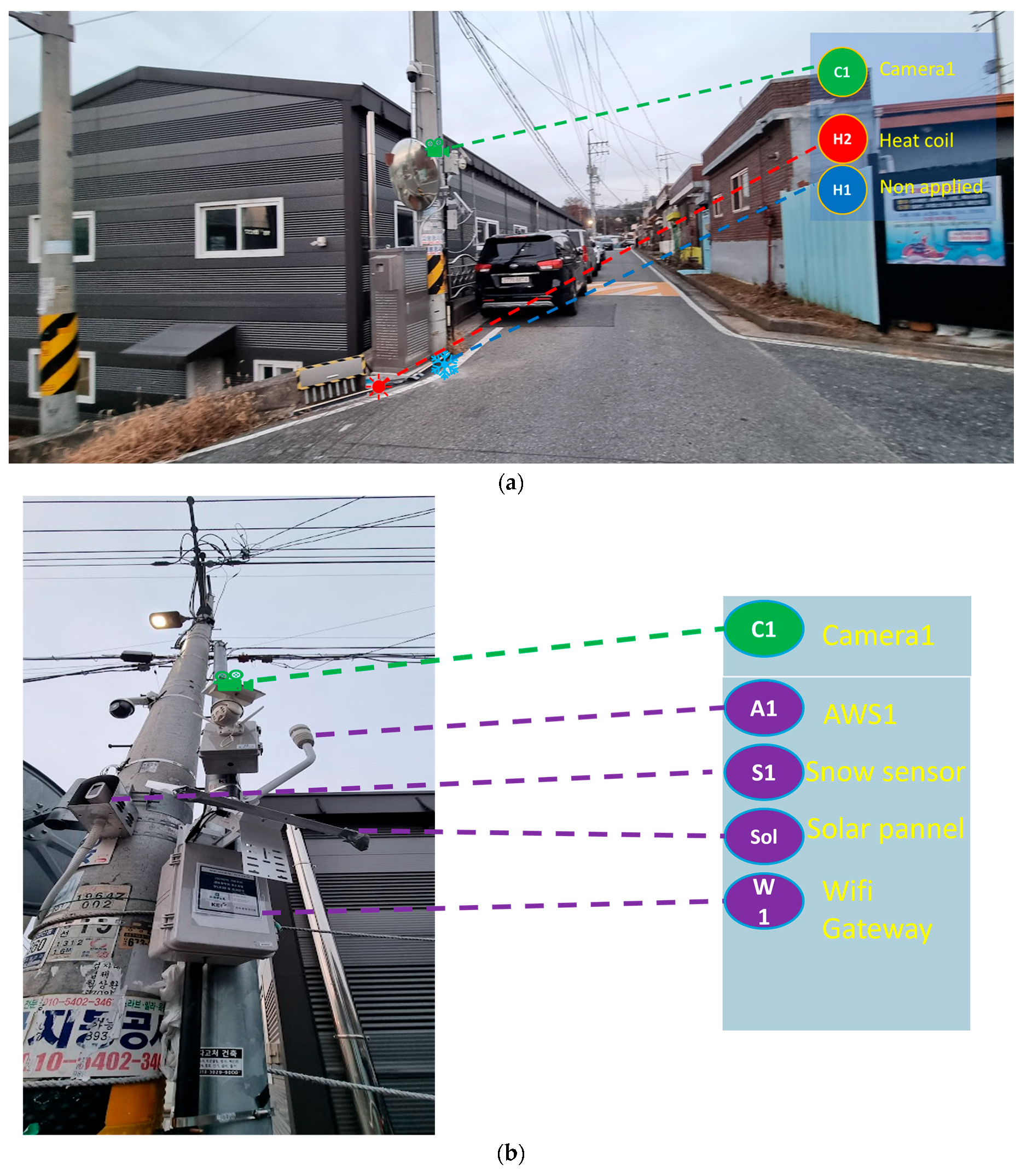 (a) Street-level view at Site A indicating the camera line-of-sight across the heated (H2, “Heat coil”) and reference (H1, “Non applied”) sections; dashed guides show the downhill direction and the baseline used for time-lapse verification. (b) Environmental monitoring system mounted on the Site A utility pole, labeling C1 = fixed camera, A1 = AWS (automatic weather station), S1 = snow sensor, Sol = solar panel, and W1 = Wi-Fi/LTE gateway for power and real-time telemetry.