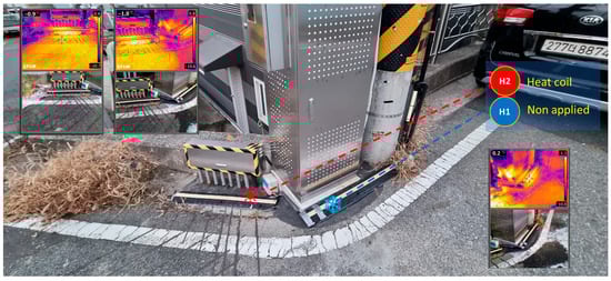We deployed a layered system from December 2024 to January 2025: AWS (air temperature, RH, wind, precipitation, radiation), surface temperature loggers, thermal imaging, UAV/drone surveys, and IP cameras for time-lapse states [,,,,,]. The modular monitoring assembly mounted on the utility pole (including AWS, snow sensor, camera, and communications) is shown (Figure 5). Sensor placement across the heated and reference sections with example thermal snapshots under RHS operation is illustrated (Figure 6).