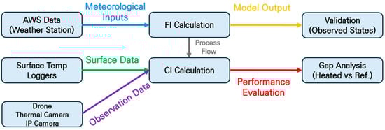 To transform raw environmental and operational data into standardized analytical form, all datasets were synchronized and pre-processed before computing the proposed indices. This subsection summarizes the data-handling workflow, from time-series alignment and FI/CI computation to validation and comparative gap analysis between heated and reference lanes.