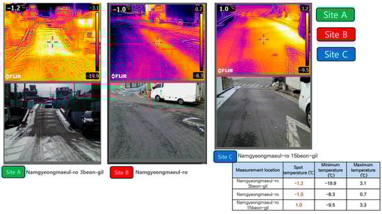 Continuous monitoring of Site A (Namgyeong-maeul 3rd Road, Daedeok-gu, Daejeon) from 17 December 2024 to 14 January 2025 revealed substantial differences between the heated and reference road sections. Results are presented in five categories: (1) surface temperature comparison, (2) thermal/drone/IP camera verification, (3) FI analysis, (4) CI analysis, and (5) integrated gap evaluation.
