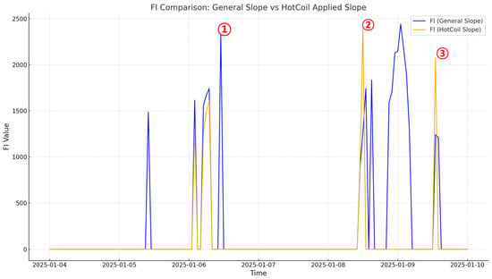 With (trigger), (surface °C), , , , > 1000 flags high icing potential [,]. FI is used as a probabilistic early-warning metric: higher FI means a higher likelihood of icing in the next hour and motivates proactive RHS activation (see the threshold classification, Table 3). Differences between the predictive FI and the evaluative CI are summarized for quick reference (Table 2).