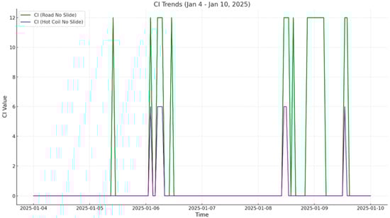 A: RHS operation factor reflecting heating application/energy during the hour (e.g., heater ON vs. reduced/idle), used to evaluate mitigation effectiveness. B: slope/road-condition coefficient representing site geometry (e.g., normalized by gradient for inclined sections); other symbols (F, T, P, W) follow the definitions in Section 2.3. CI is a severity index that integrates the observed freezing frequency/duration with site conditions (slope) and operation state of the road-heating system. The coefficients A (RHS operation) and B (slope/road condition) are calibrated for the project (e.g., A = 1 for heated, 0.5 for non-heated; B = 1.0 flat, 0.8 slope). CI is suited for after-the-event evaluation: it quantifies residual icing severity and the effectiveness of RHS; larger CI implies greater hazard, as illustrated in the worked example Figure 7.