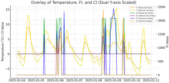 We operationalized FI and CI directly from field-measured signals with transparent transformations. This formulation follows established road-surface energy-balance and icing-prediction principles, where pavement temperature evolution results from radiative, convective, and conductive fluxes under meteorological forcing [,,,,,]. The freezing trigger (F) equals 1 when both (i) a hydrometeor signal is present (rain/snow) and (ii) the pavement temperature is below 4 °C; otherwise, F = 0. Temperature (T) enters as the road-surface temperature factor. Hydrometeor (P) and wind (W) contribute small additive multipliers (+0.1 each when present) to reflect observed persistence. The CI index incorporates the actual RHS power (A, kWh-based) and a slope coefficient (B) defined by slope class: B = 0.8 for ‘slide’ (sloped) and B = 1.0 for ‘no-slide’ (flat). Empirically, sloped (“slide”) segments exhibited greater icing persistence and required higher heating power to maintain equivalent safety. Therefore, placing B in the denominator ensures that, for identical meteorological and operational conditions, sloped segments (smaller B) yield larger CI values, realistically representing higher residual risk.