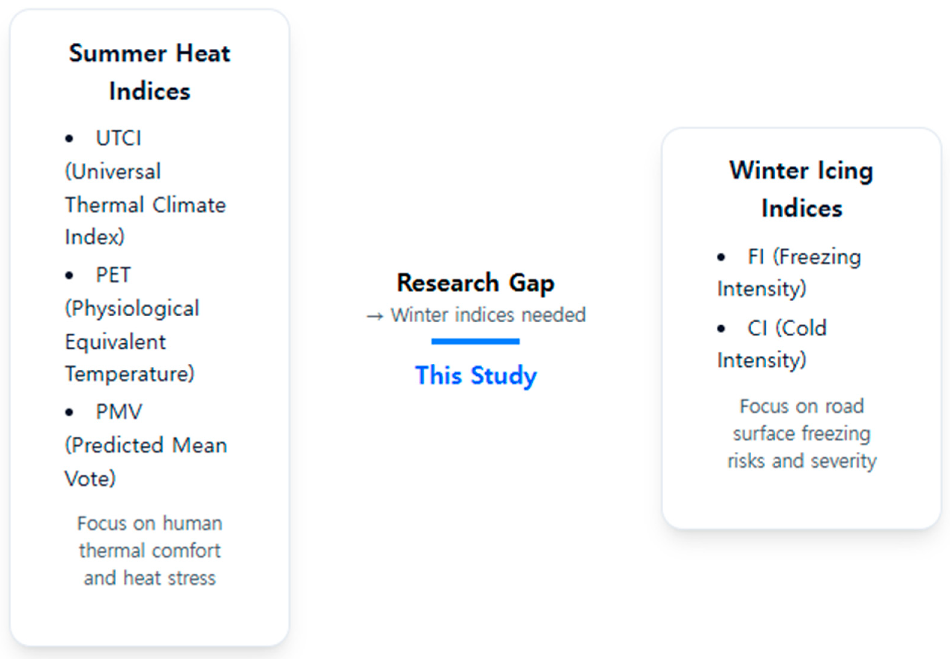 While thermal-comfort indices such as UTCI or PET assess human heat stress, this study focuses instead on operational indices that quantify pavement icing and mitigation efficiency [