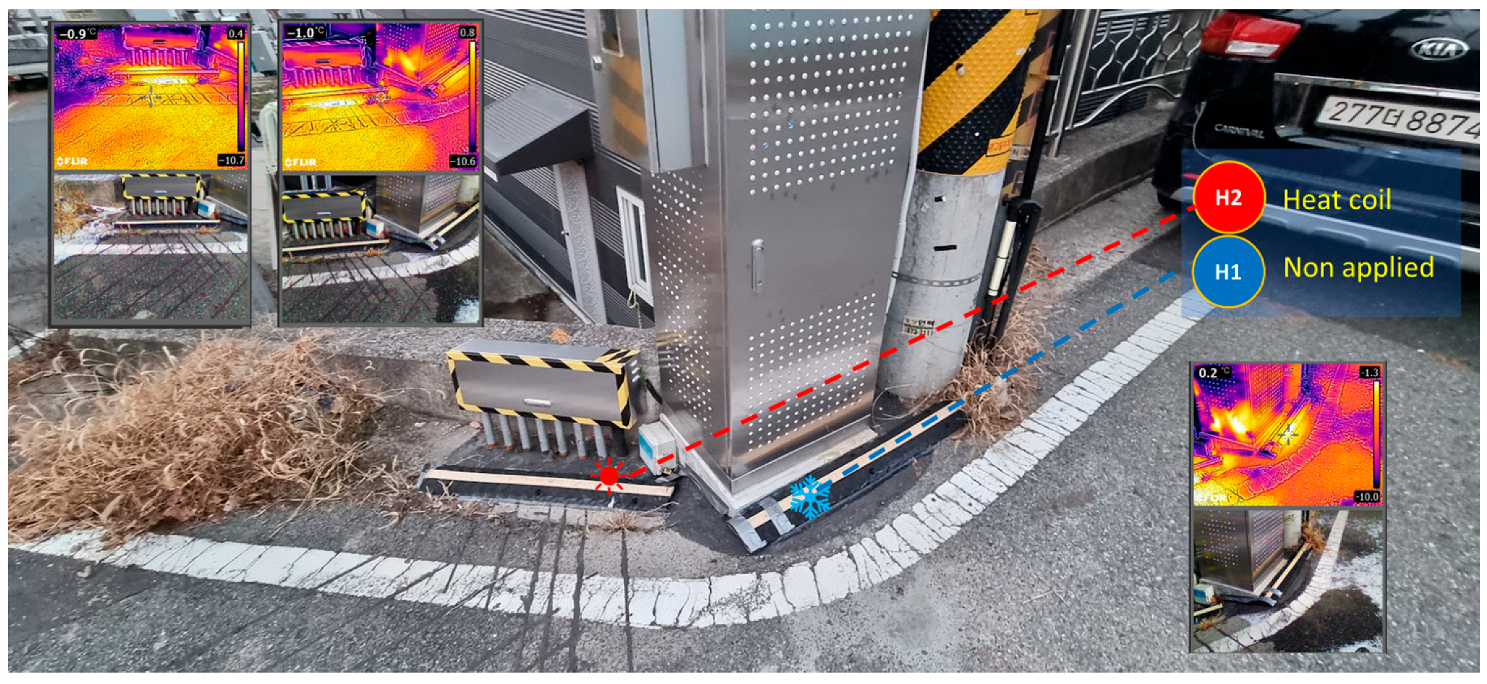 - Lim, H.; Lee, S.; Lee, J. Effective snow removal devices for road pavement using geothermal heat pipe. Appl. Therm. Eng. 2025, 265, 125624. [Google Scholar] [CrossRef]