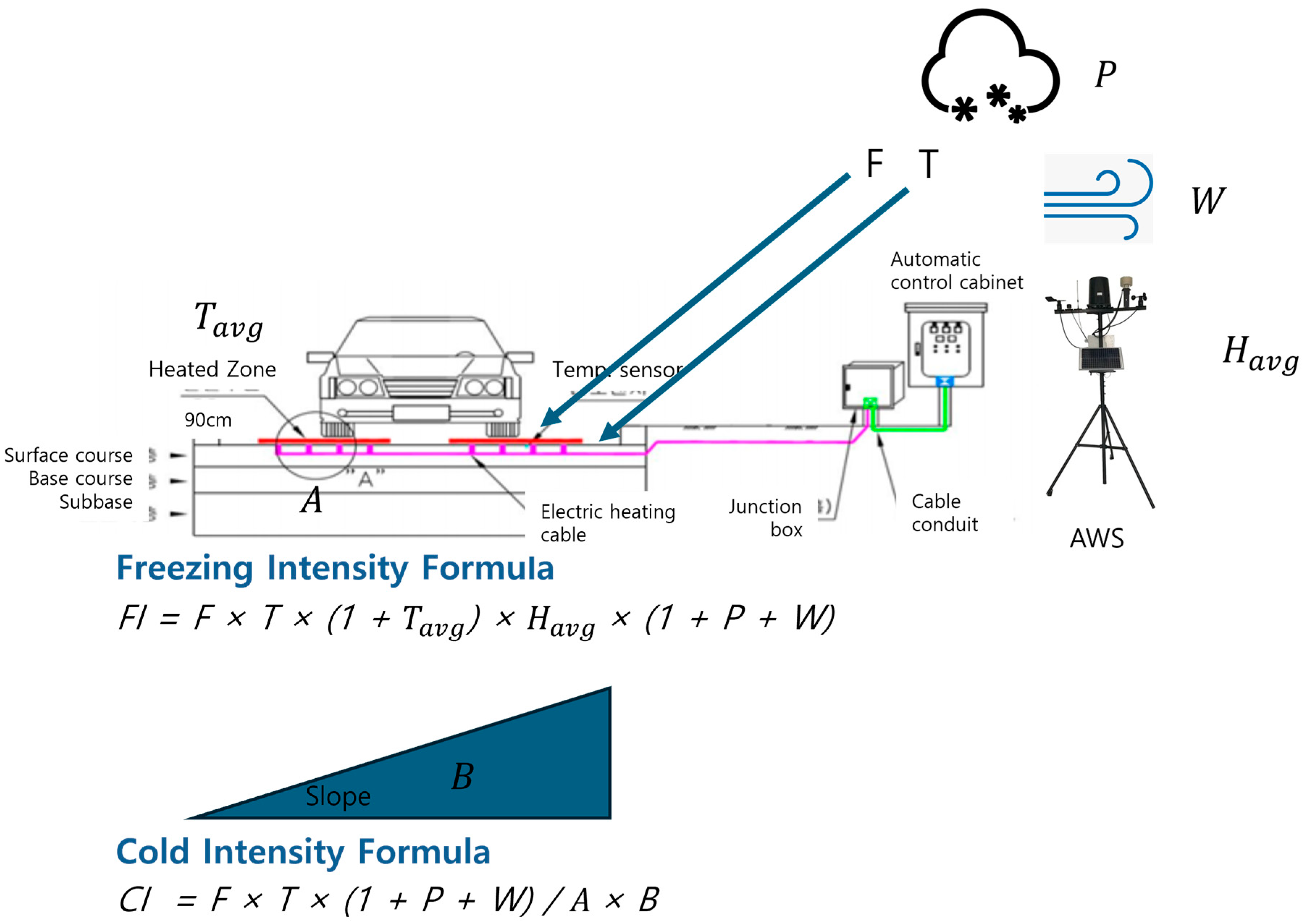 Figure 7 Schematic of FI and CI computation with monitoring layout. An AWS provides air variables (precipitation, wind, humidity), while surface loggers measure pavement temperature at 5 min intervals in heated and reference sections. Variables used in Equations (1) and (2) are: F, T,