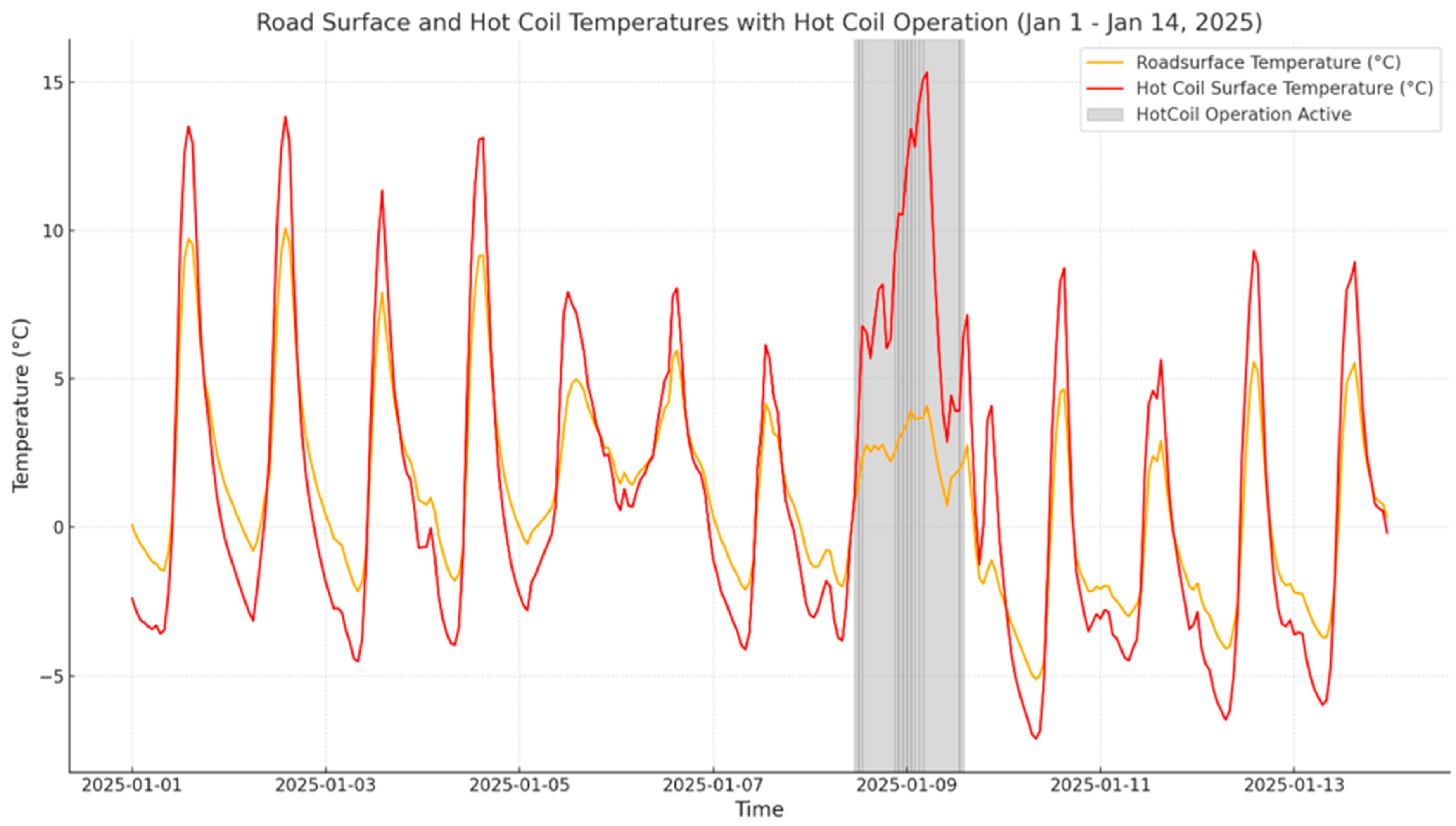 Comparison of surface temperatures between heated and reference Sections (1–14 January 2025).