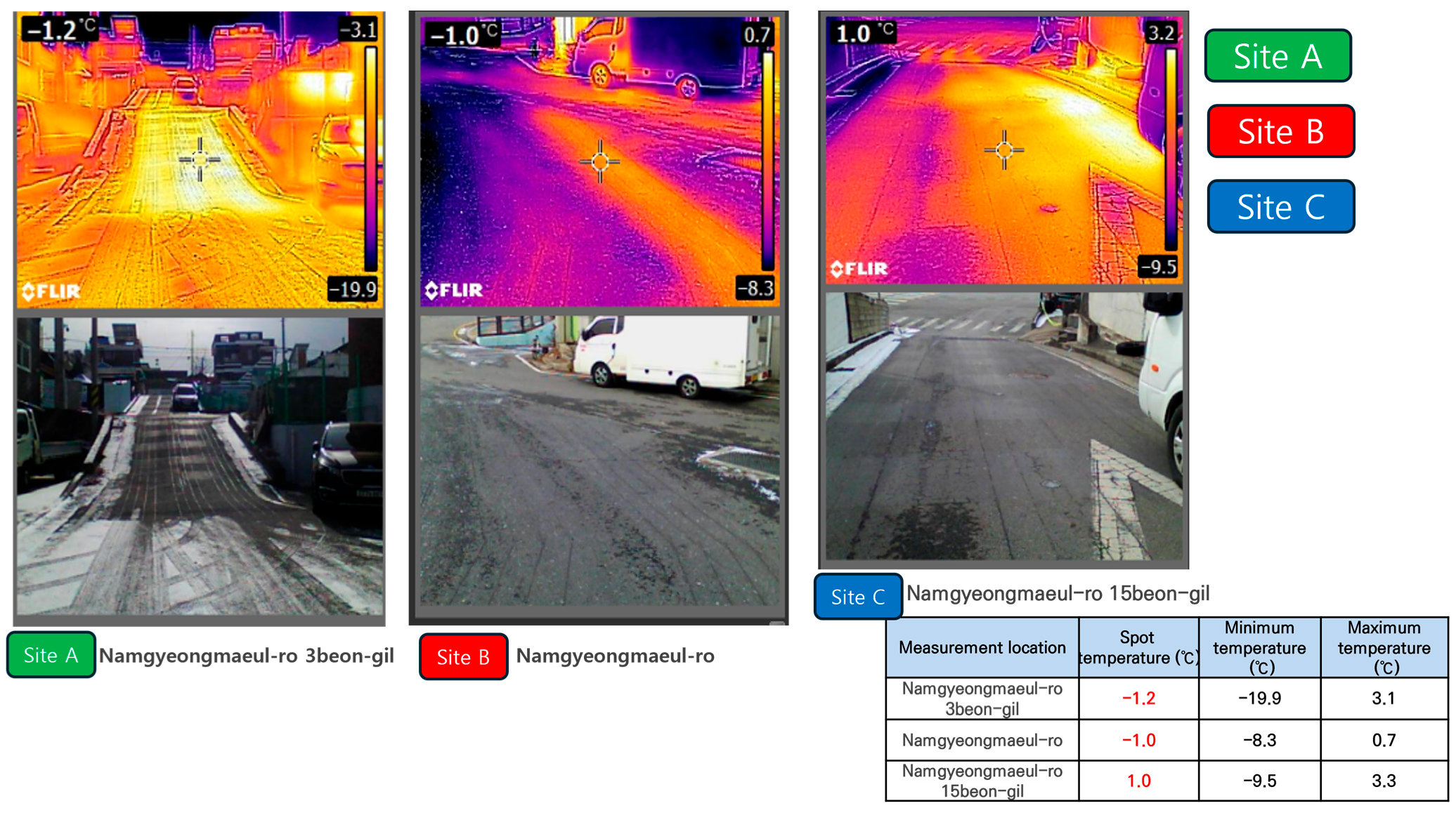 The field study was conducted on Namgyeong-maeul 3rd Road (Site A) in Daedeok-gu, Daejeon, South Korea, a steep residential slope with a length of approximately 70 m and an average gradient of 11.9%. This site was chosen because it represents the most hazardous segment among three RHS-installed locations, and it has a high frequency of winter icing accidents. The surrounding residential area is densely populated with elderly residents and vulnerable groups, making safe mobility during winter a critical social concern. A site overview image highlighting the steep slope and residential clustering is provided (