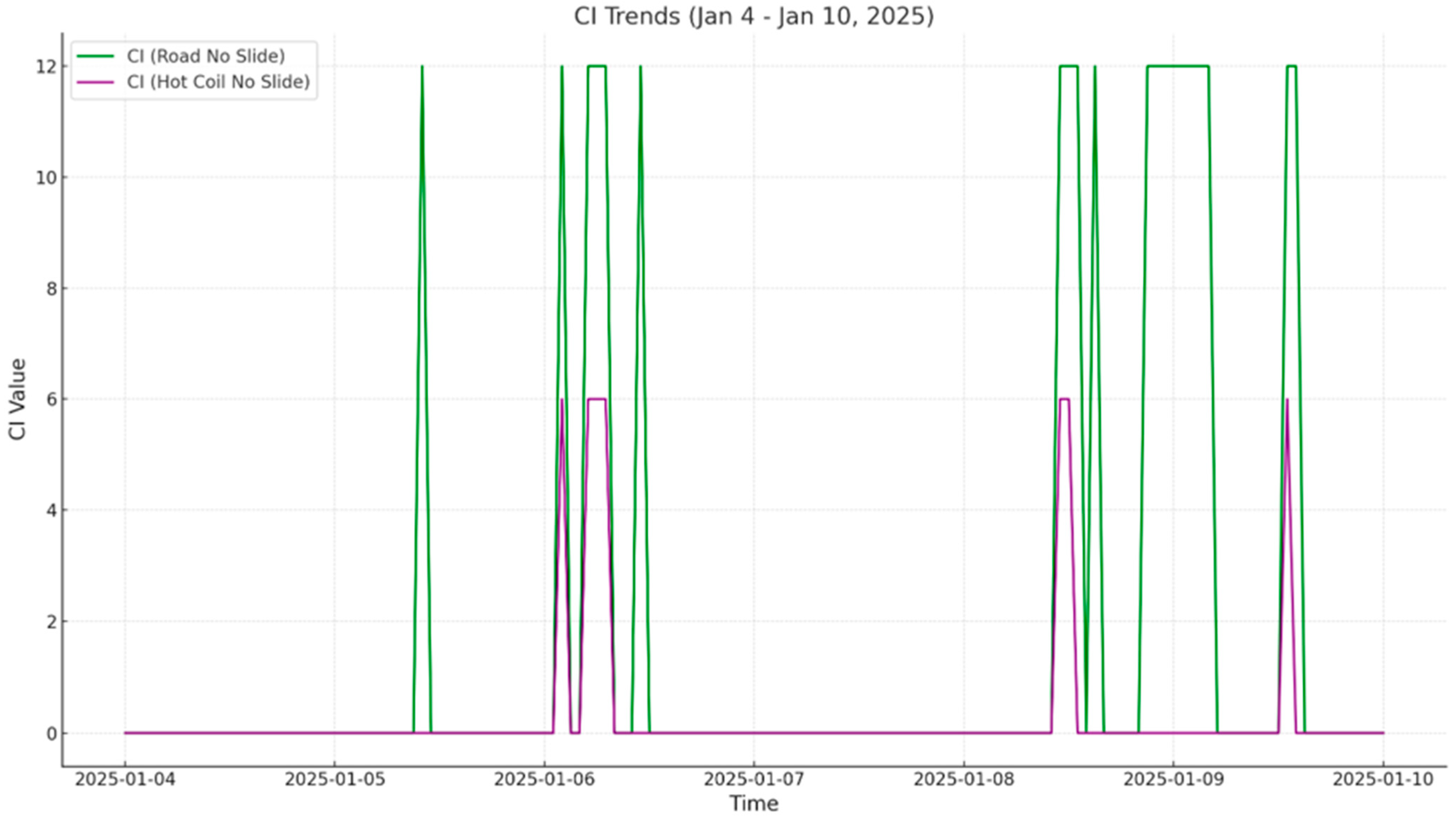 Time-series of CI values for heated (Hotcoil) and reference (Road) sections at Site A, Namgyeong-maeul 3rd Road, Daejeon (4–10 January 2025).