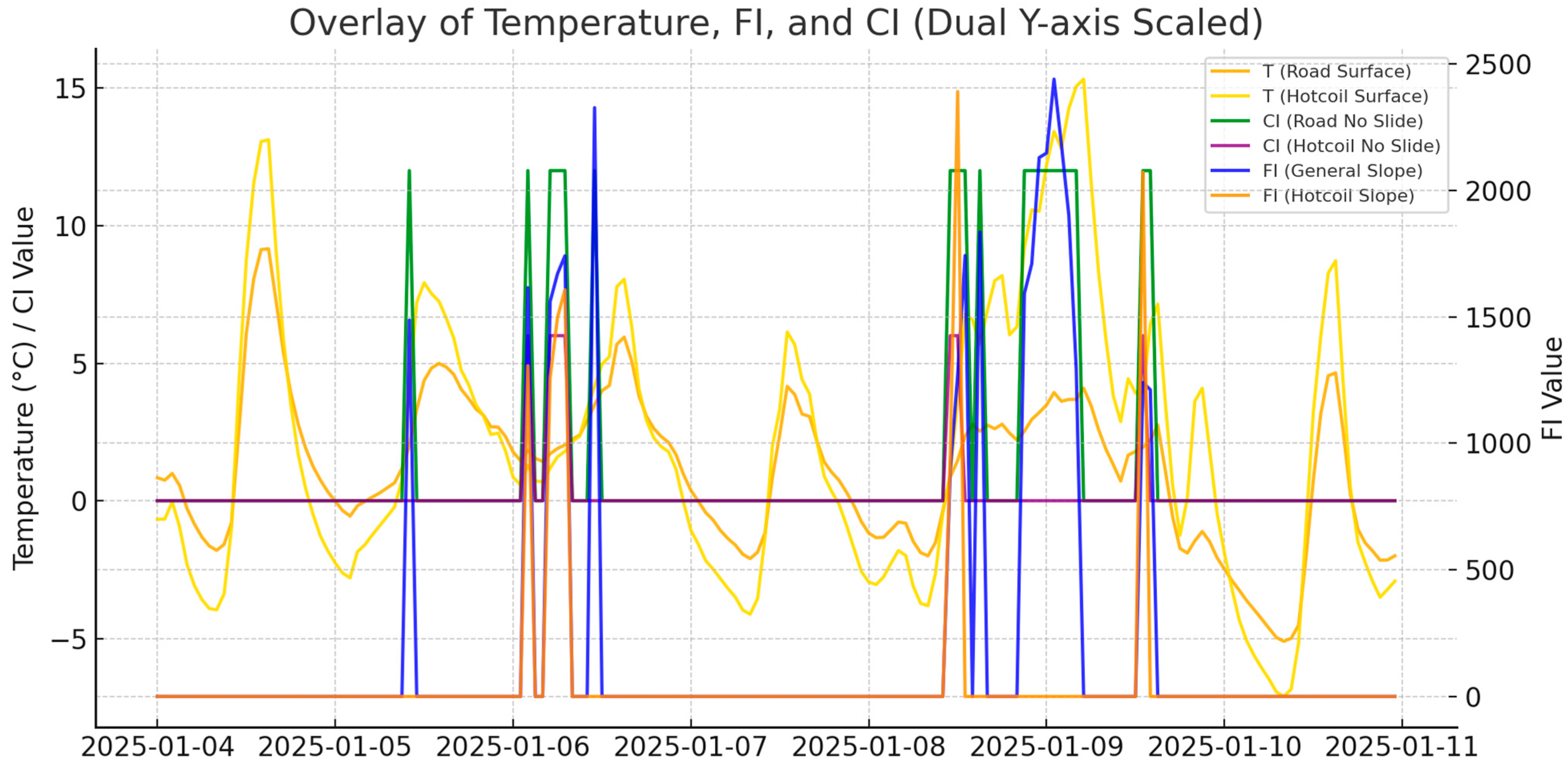 We operationalized FI and CI directly from field-measured signals with transparent transformations. This formulation follows established road-surface energy-balance and icing-prediction principles, where pavement temperature evolution results from radiative, convective, and conductive fluxes under meteorological forcing [