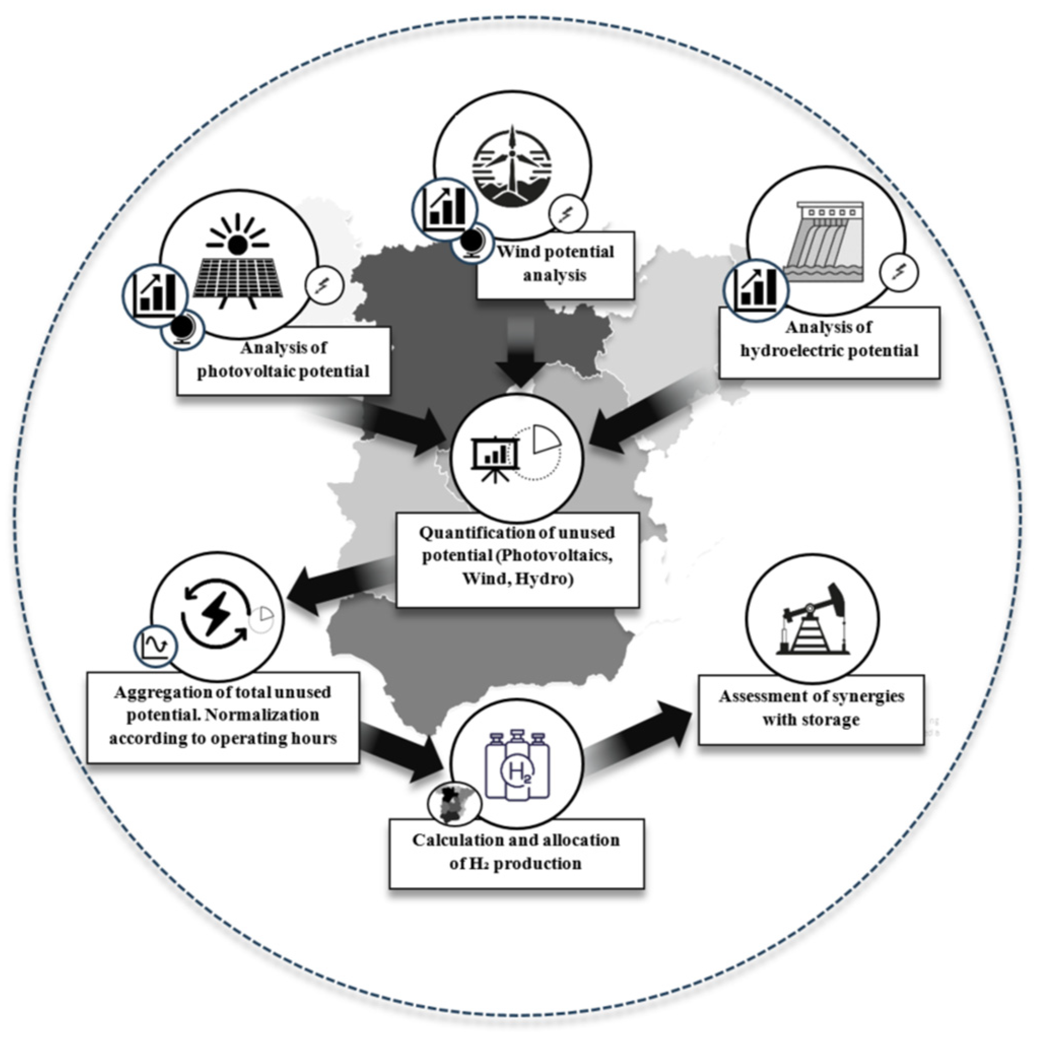 Figure 1 shows the general flow of the methodological process, from the estimation of untapped renewable potential to the conversion into theoretical green hydrogen and its regional distribution.