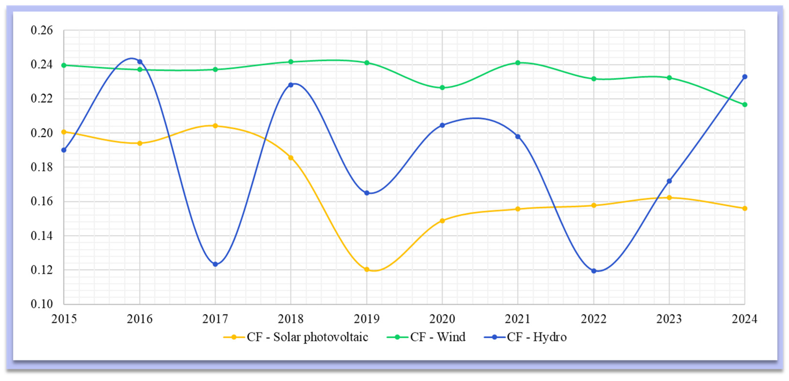 Analysis of the temporal evolution of the average annual capacity factors (CF) of photovoltaic, wind and hydroelectric energy in Spain during the decade 2015–2024 allows us to identify relevant patterns regarding the operational efficiency and interannual stability of each technology (
