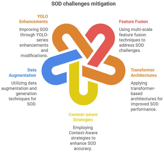 - Critical taxonomy of contemporary methods: We have generated a critical taxonomy that classifies contemporary SOD approaches into five distinct yet coherent categories: (1) multiscale feature learning; (2) transformer networks; (3) context-aware methods; (4) data augmentation; (5) architectural improvements in standard detectors. This systematic approach affords a critical perspective on the progression of these efforts and helps clarify how contemporary SOD methods solve the original challenges.