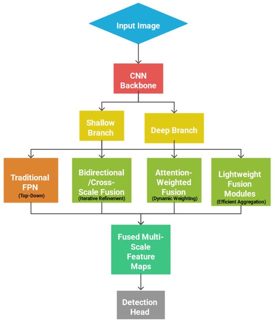 Second, the fusion “mechanisms” themselves have also evolved. Rather than practicing simplified element-wise addition or concatenation, newer methods have employed professional-grade, attention-based processes or dynamically weighted fusions. This approach allows multiscale features to be weighted and retaken to the most informative multiscale features to achieve the best classification precision and allows the multiscale feature fusion to actually “learn” multiscale features for the classification of detected objects through the input. For instance, attention is simply incorporated into the fusion process to refine the aggregation of multiscale features and thereby improve the detection accuracy in cluttered images where small objects are present [21]. For instance, the PARE-YOLO model incorporates attention-based, multiscale features into its model methodology, increasing weights using multiscale features to ensure the categorization of all detected objects from aerial imagery [22]. Figure 4 shows that features flow from the backbone into shallow and deep layers and are fused via four families—the traditional top–down FPN, bidirectional/cross-scale fusion, attention/dynamically weighted fusion, and lightweight modules—converging into fused multiscale maps that feed the detection head, thereby bridging advanced fusion mechanisms with the shift toward lightweight, efficient fusion.