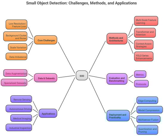 Object detection is a core computer vision task that involves finding and localizing objects in an image and has achieved considerable success with the advent of deep learning [1]. The general performance of detectors declines rapidly for small objects [2]. Due to the direct impact on many high-stakes, real-world SOD applications, this subfield of object detection has emerged as an important area of focus. For instance, the successful completion of search and rescue, precision agriculture, and infrastructure inspection tasks from aerial imagery collected via unmanned aerial vehicles (UAVs) depends heavily on SOD [3]. In autonomous vehicles, determining the distance of a pedestrian, another vehicle, or road debris not only requires SOD but also relies on it [4]. In industrial manufacturing, small-defect detection is critical to maintaining the quality assurance of products, while in medical imaging, the detection of microscopic lesions could be the difference between life and death [5,6].