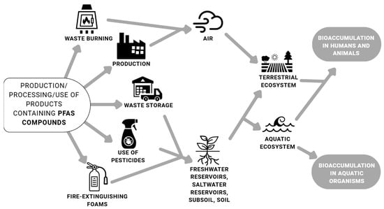 The use of PFAS-containing pesticides and insecticides in agriculture can lead to their unintended accumulation in soil and plants, negatively affecting crop yields. Studies have demonstrated that PFASs readily migrate into groundwater [26], tap and bottled water [30], and surface water [31]. They are released at almost every stage of their life cycle, from production, processing, and use to disposal [15].