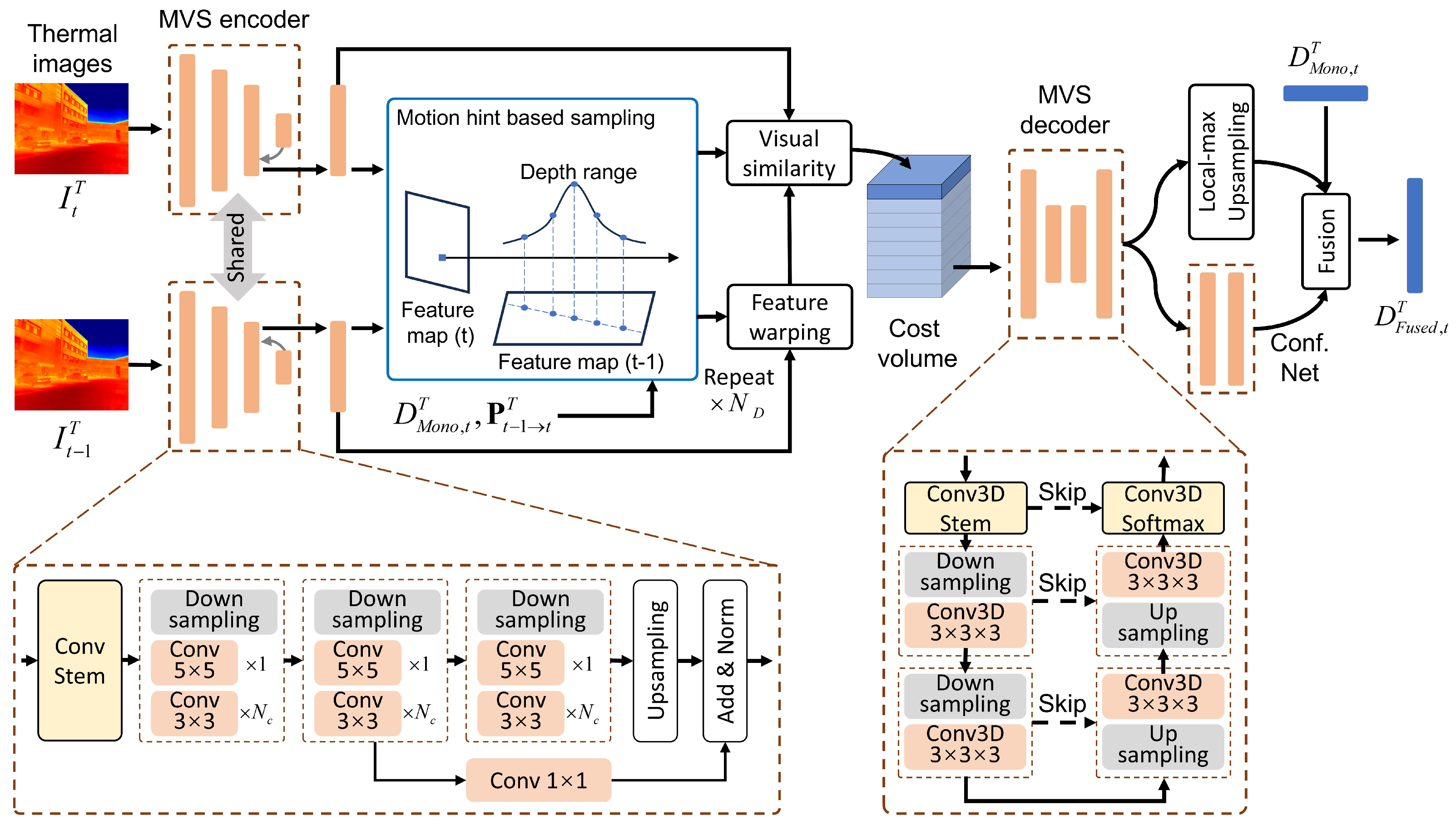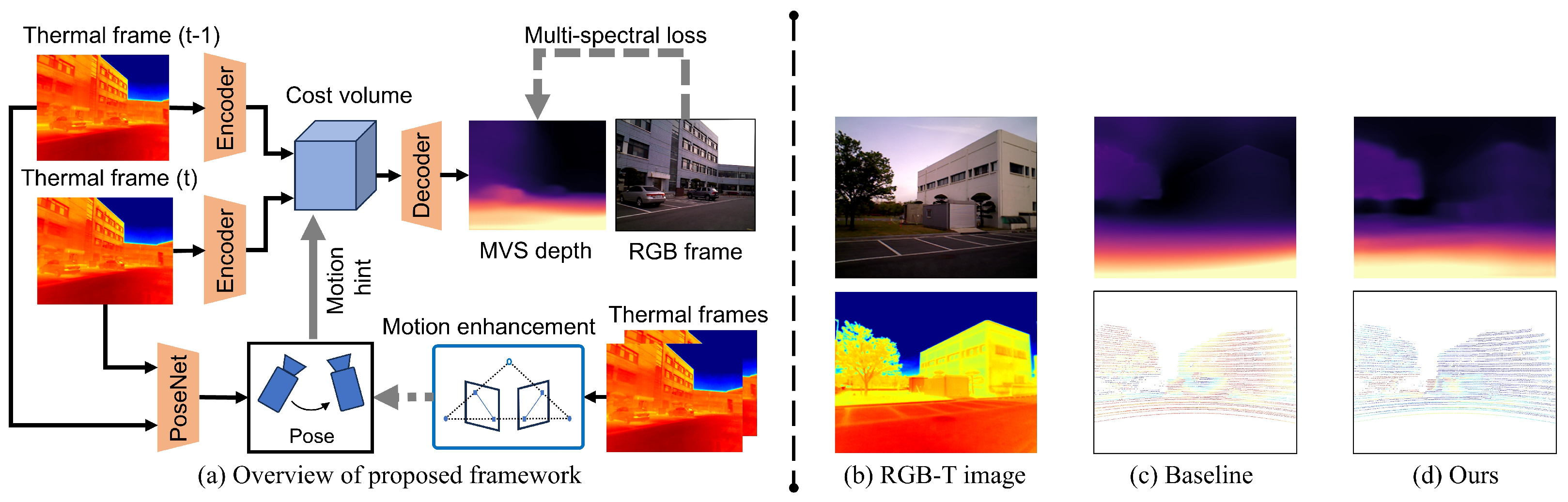 - We propose a self-supervised multi-frame depth and ego-motion learning framework for monocular thermal videos. It successfully leverages the temporal advantages of multiple thermal frames by constructing the multi-view stereo. The accuracy of prediction results is further improved through the integration of motion hints and multi-spectral properties.
