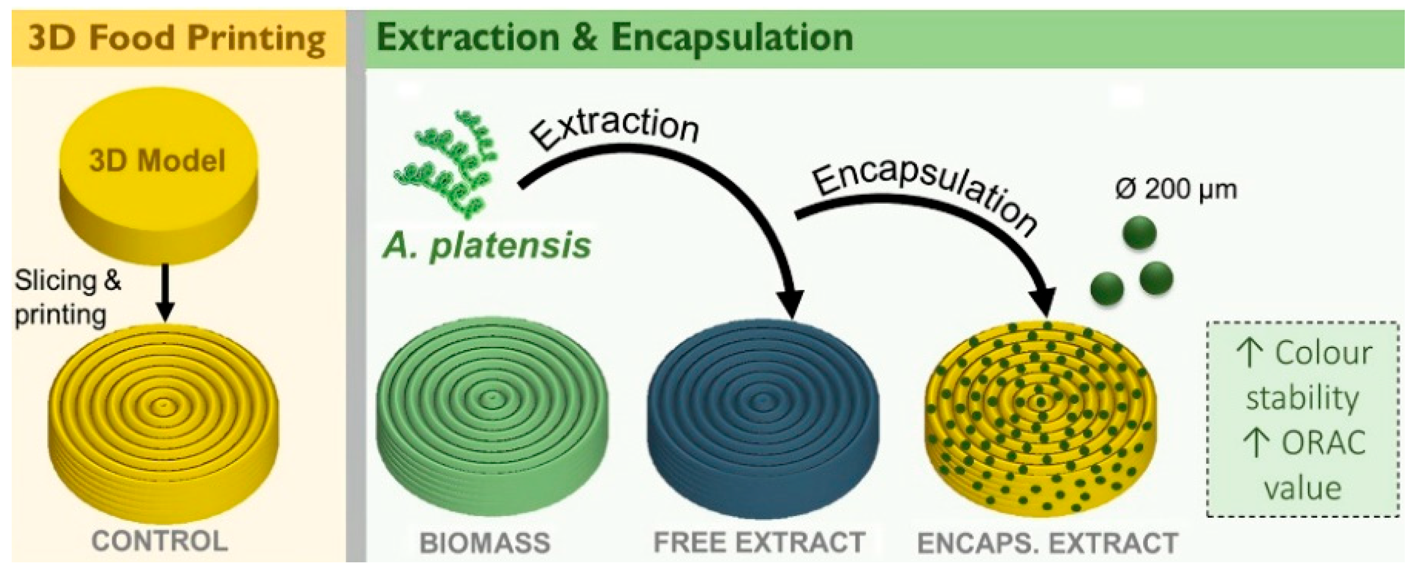 - Donn, P.; Prieto, M.A.; Mejuto, J.C.; Cao, H.; Simal-Gandara, J. Functional Foods Based on the Recovery of Bioactive Ingredients from Food and Algae By-Products by Emerging Extraction Technologies and 3D Printing. Food Biosci. 2022, 49, 101853. [Google Scholar] [CrossRef]