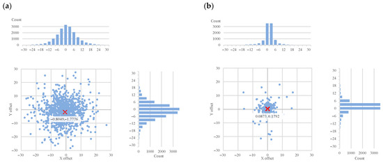 The differences in Algorithm 3 objects and the manual ground truth (a) and generated ground truth (b) marker locations (the axes of the charts represent the image coordinate axes), with histograms for each axis. The red ‘X’ marks the mean offset.