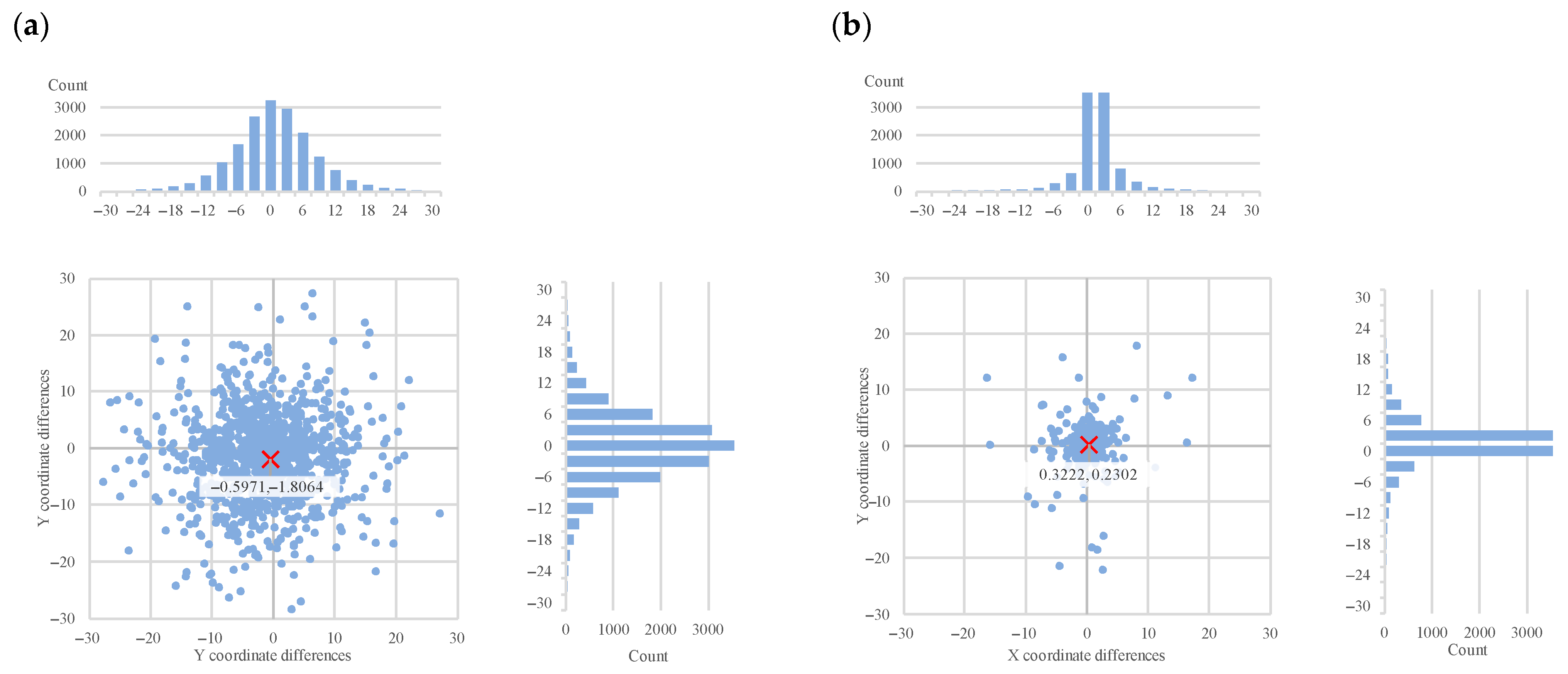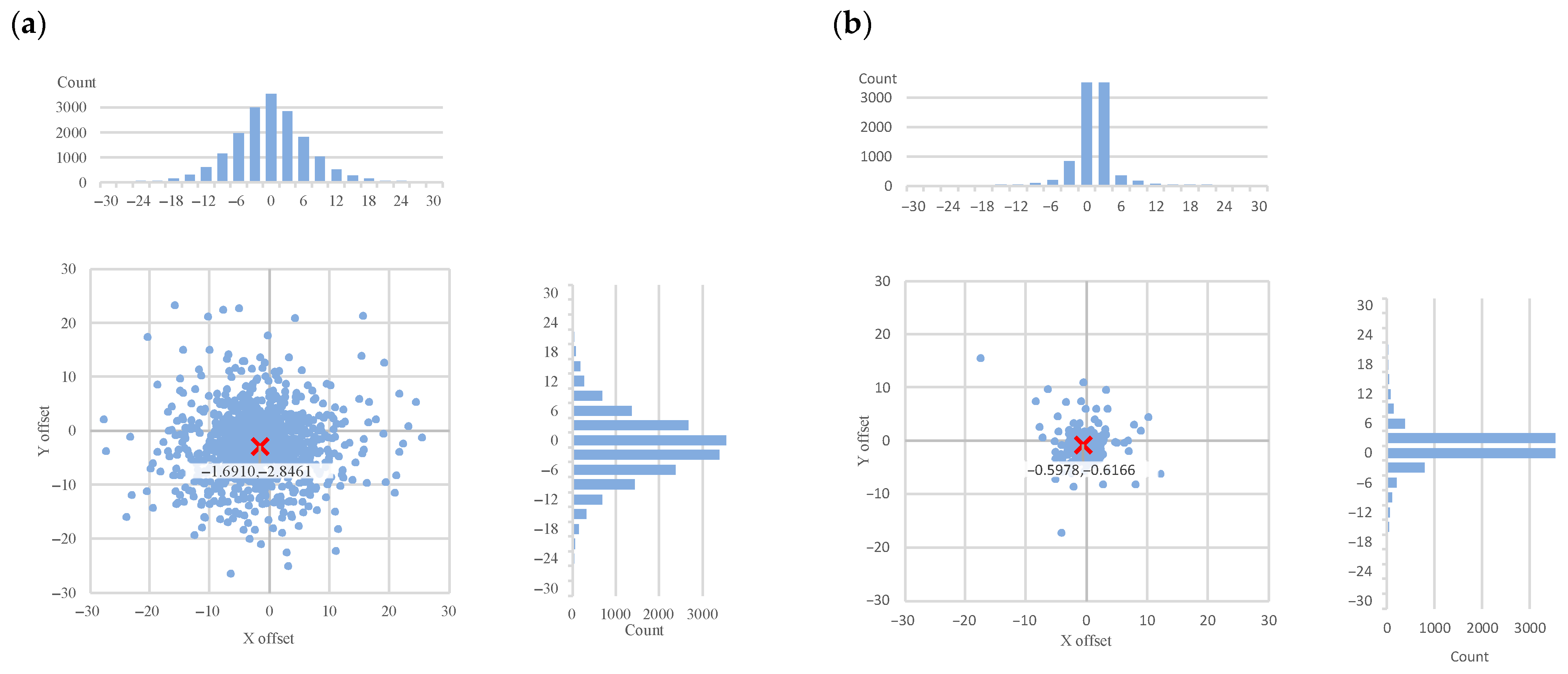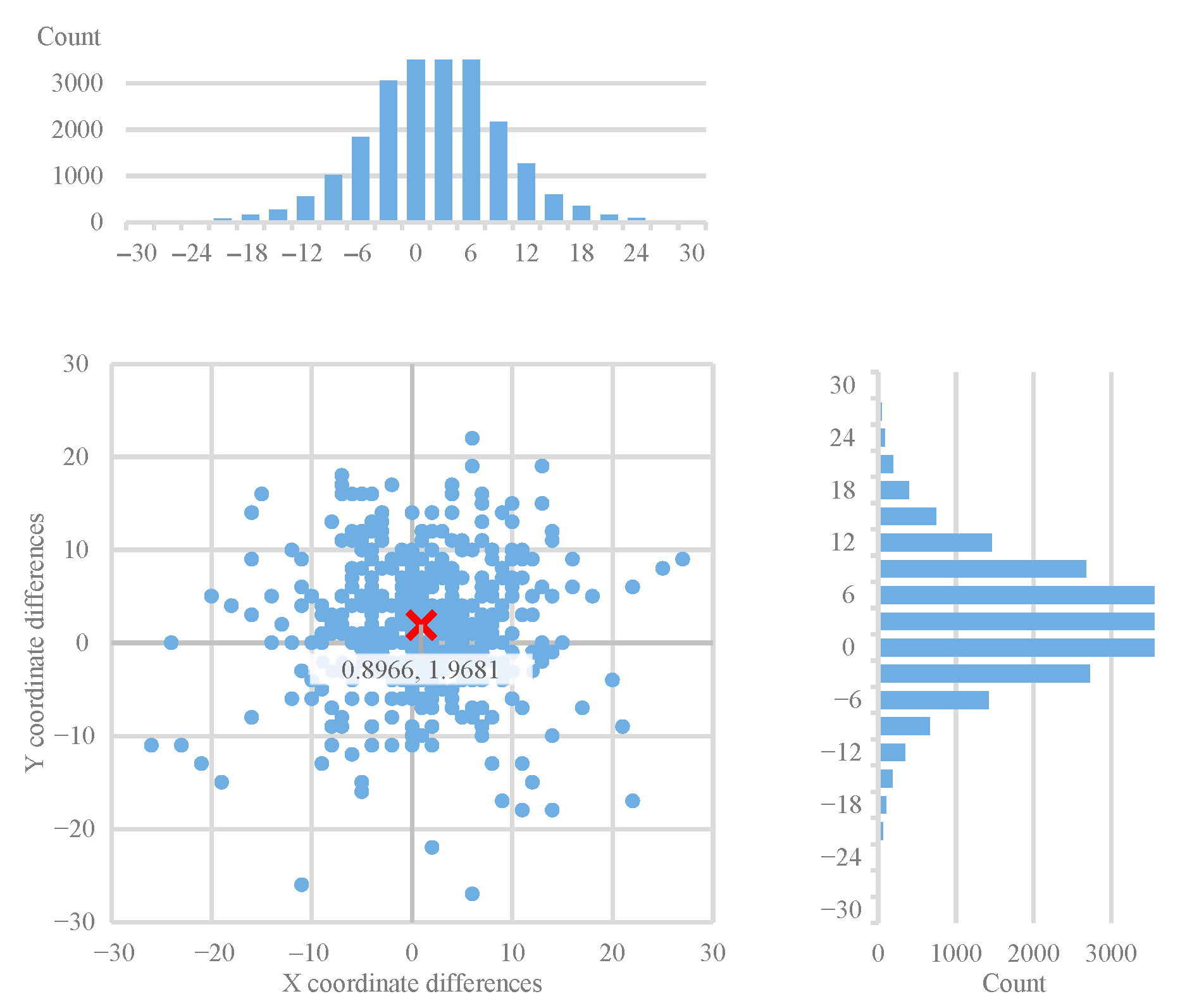 We included all the offset maps, showing the differences between the ground truth landmarks (both original and generated) and the objects detected by the three algorithms. These show the differences in two dimensions, and we added projected histograms to show the distribution of these data points. Here the important results are the decrease in the offsets (