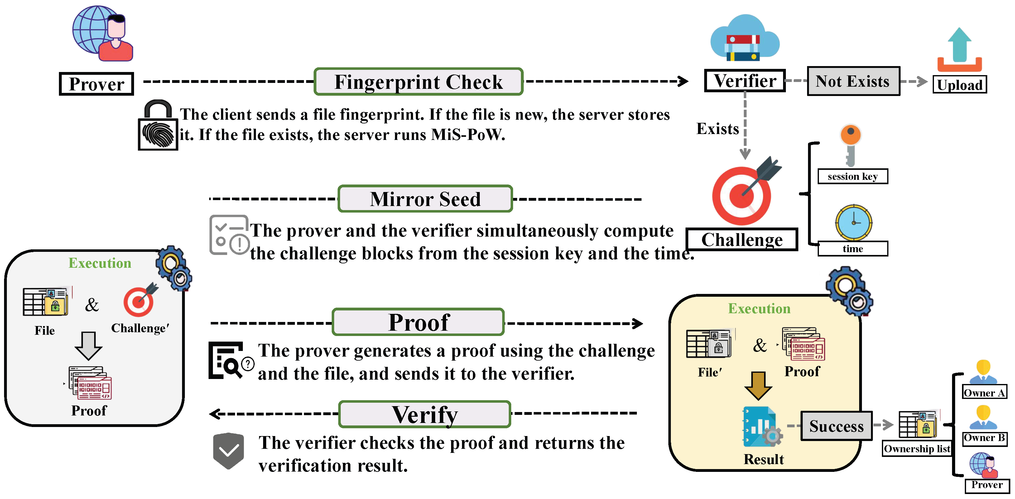- Session bound and non-interactive challenges. We introduce MiS-PoW, which mirrors challenges on the client and the server. The protocol derives a common seed from the TLS exporter, a discretized time value, and a file identifier. The design removes extra round trips, prevents replay, and limits seed manipulation. The approach requires no change to the TLS trust model.