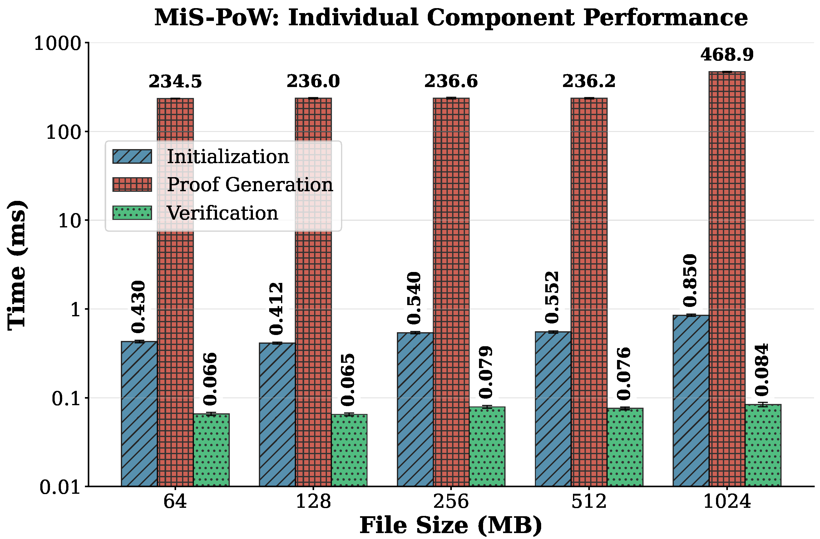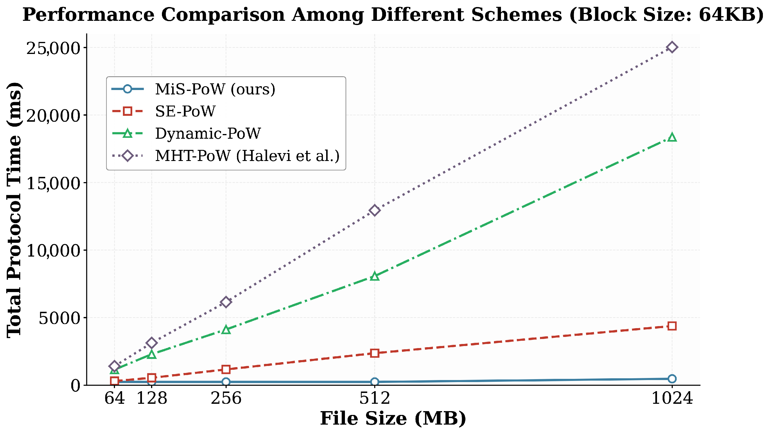 | File Size (MB) | MiS-PoW | SE-PoW | Dynamic-PoW | MHT-PoW |