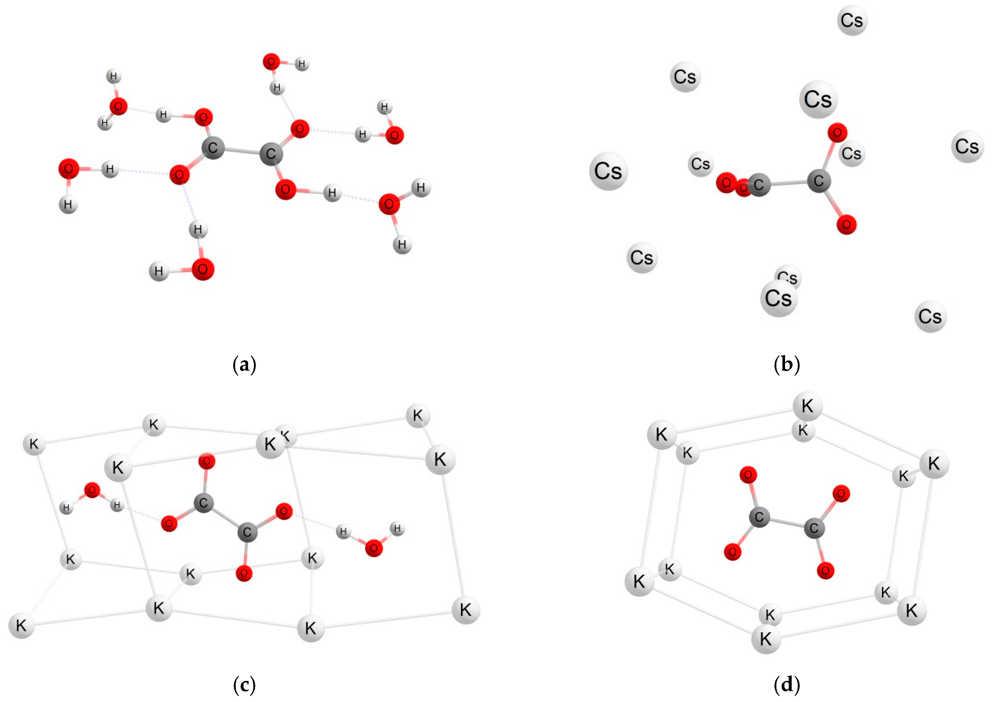 - Dinnebier, R.E.; Vensky, S.; Panthöfer, M.; Jansen, M. Crystal and Molecular Structures of Alkali Oxalates: First Proof of a Staggered Oxalate Anion in the Solid State. Inorg. Chem. 2003, 42, 1499–1507. [Google Scholar] [CrossRef]