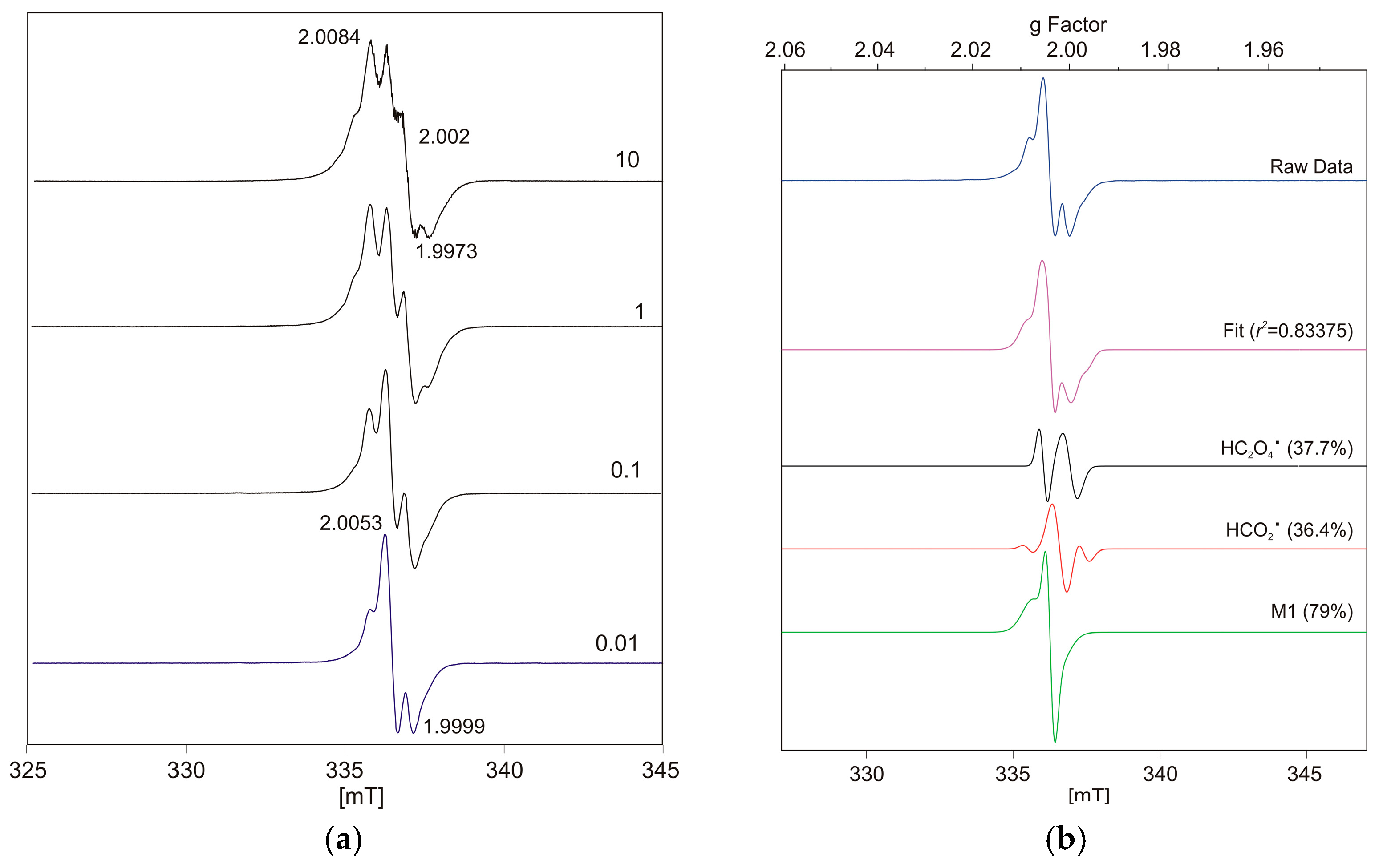 | Dominant Signal | HCO2• Contribution (Orthorhombic, gavg ≈ 2.0026) | HC2O4• Contribution (Axial, gavg ≈ 2.0035) | r2 (Fit Quality) | ν [GHz] | Power (P) [mW] |